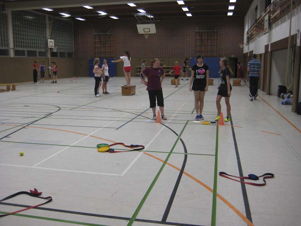 Los ging es am Freitagnachmittag mit dem Thema Koordination. Dabei mussten die Schülerinnen und Schüler Zirkel zu den einzelnen koordinativen Fähigkeiten erstellen. Im Anschluss durften sich die jungen Leute unter Anleitung der Sportlehrer Inga Gerlings und Georg Weingarten tüchtig „auspowern“, zum Beispiel mit Turnübungen oder Ballspielen – natürlich begleitet von fetziger Musik, die die Lernenden mitgebracht hatten. Das leibliche Wohl wurde selbstverständlich nicht vergessen: Sieben Bleche mit Pizza sowie viele Süßigkeiten stärkten die jungen Sportler wieder mit dem Nötigsten.