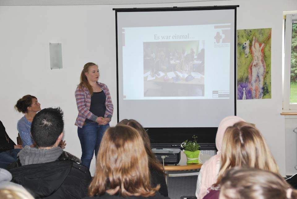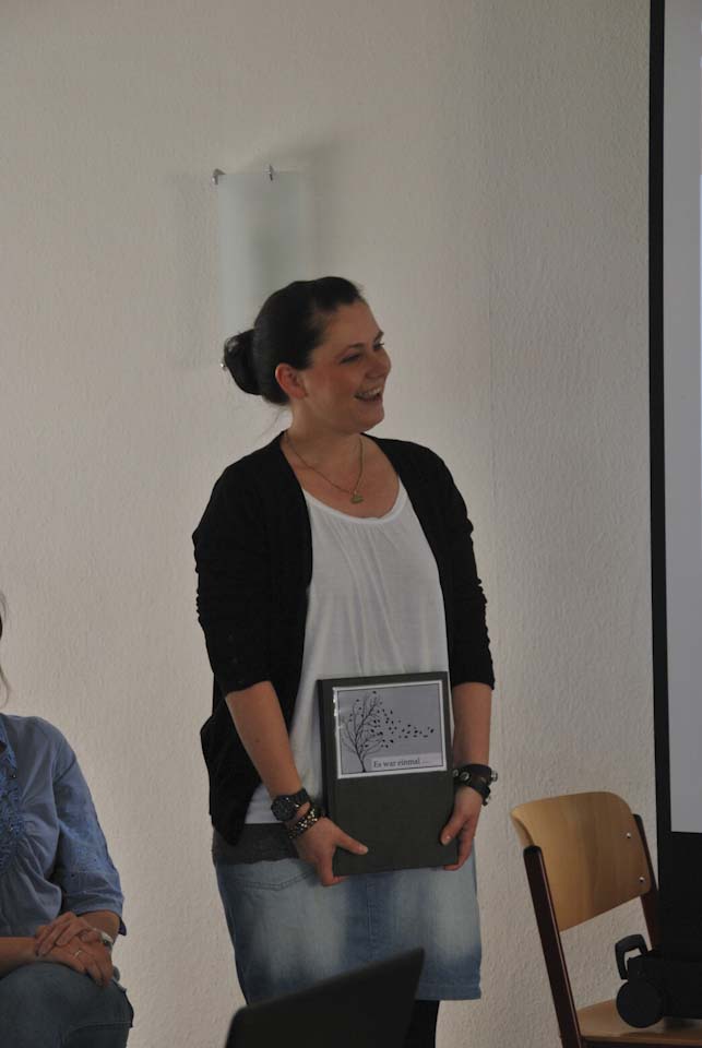 Irina Rebbe berichtete, wie die Idee entstand, die Schülerinnen und Schüler der Unterstufen fiktive Geschichten über reale Mendener Juden, die in der NS-Zeit eines gewaltsamen Todes gestorben waren, schreiben zu lassen. Nachdem Kriegs- und Holocaust-Fotos, untermalt von Musik, gezeigt wurden, lasen Melissa Gwiosda (FHR U 1), Daniel Grote U 4 (FHR U 4) und Lukas Radigk (FHR U2) ihre Geschichten beispielhaft vor – ein Gänsehaut-Moment, der alle Anwesenden tief berührte. Die Geschichten gerieten insgesamt so ergreifend, dass sie sie zu einem Buch mit dem Titel „Es war einmal …“ gebunden wurden. Eine Spende von Mirko Kruschinski (Continentale Versicherung Menden) ermöglichte es, 50 Bücher drucken zu lassen, die in der Schule für 3,50 Euro verkauft werden.