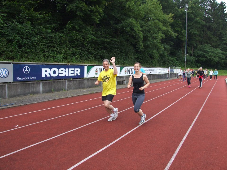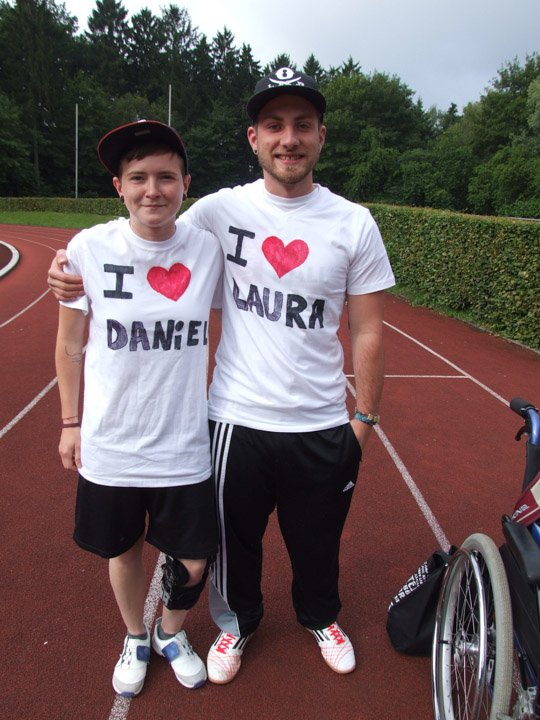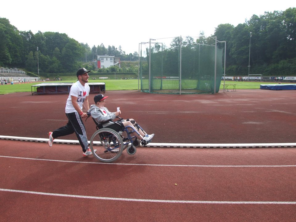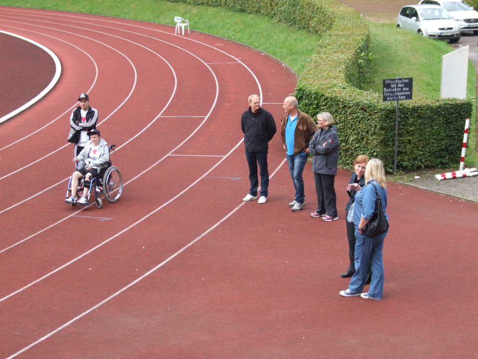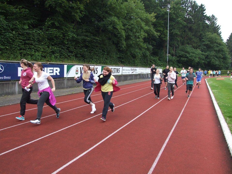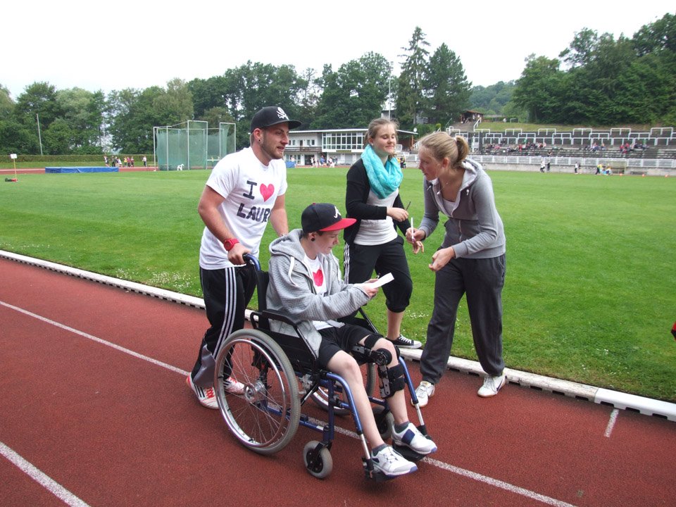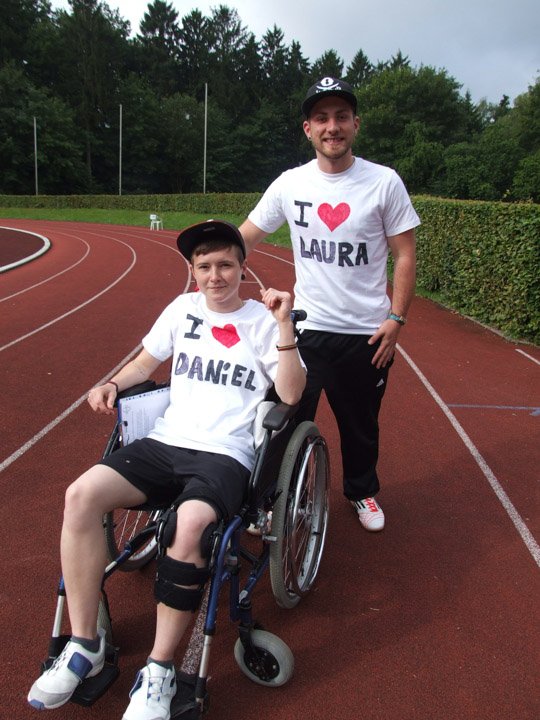 Voller Ehrgeiz angesichts der guten Sache liefen Schüler und Lehrer los. Besonderes Engagement zeigten dabei Laura Baumeier und Daniel Grote aus der FHR-U4. Laura hat eine Knieverletzung und kann zurzeit schlecht laufen. Für den Sponsorenlauf mietete sie eigens einen Rollstuhl, den Klassenkamerad Daniel Runde um Runde durch das Huckenhohl-Stadion schob. Dementsprechend voll waren ihre zwei (!) Sponsorenzettel, viele unterstützten sie. Auch die muslimischen Schülerinnen und Schüler liefen trotz des gerade begonnenen Fastenmonats Ramadan mit, allerdings vorsichtshalber langsamer als gewöhnlich.