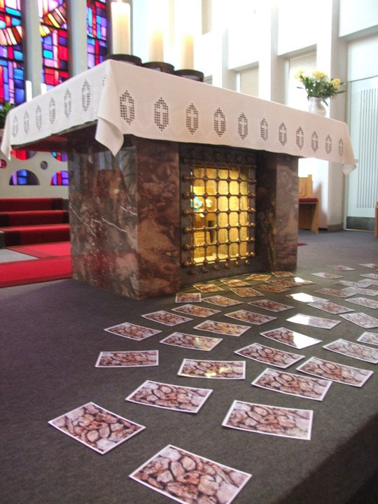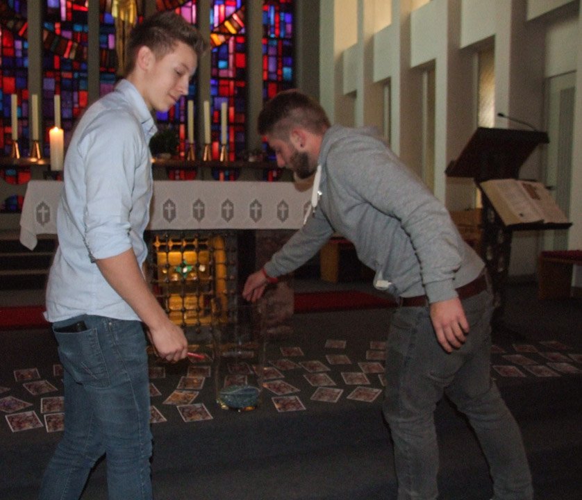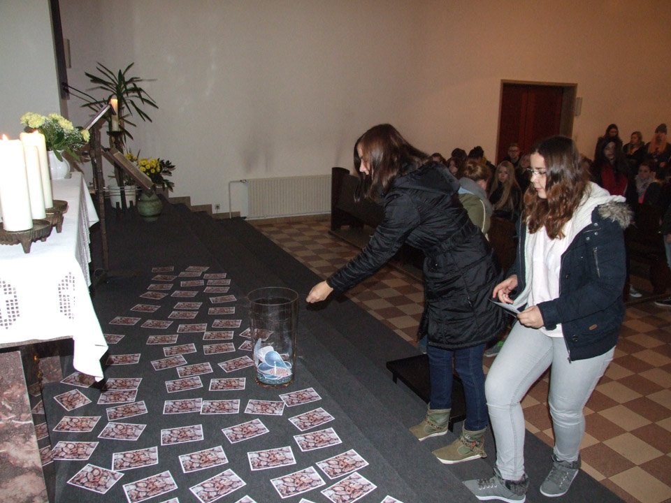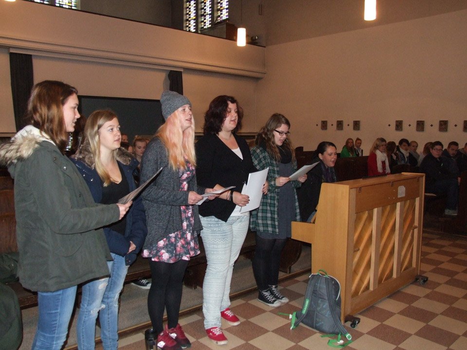 Der Schulchor (Jana von der Linde, Teresa Pflogsch, Selina Schankweiler, Sabrina Bitter und Deborah Lehmann) stimmte unter der Leitung von Irina Rebbe die etwa 80 Anwesenden wunderbar musikalisch ein, Irina Rebbe und Anne Junker sprachen Texte nicht vom Altarraum aus, sondern von ihren Sitzen inmitten der Schülerschaft. Zwischendurch gab es immer wieder stille Momente – keine bedrückende Stille, sondern eine Stille, die Möglichkeiten offerierte und Hoffnung ausdrückte. Tränen waren nicht beschämend, sondern befreiend, und sie flossen in der Atmosphäre der Gemeinschaft ganz natürlich. Still namen sich Freunde in den Arm, wurden Hände in den Sitzreihen gedrückt. Auch bei den Fürbitten hielten sich alle an den Händen. Auf Tränen aus Papier schrieben die Anwesenden, was sie traurig macht, und sammelten diese in einem Glas vor dem Altar: „Sammle meine Tränen, Gott, in deinem Krug und keine geht verloren“, hieß es frei nach Psalm 56.