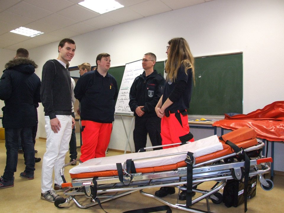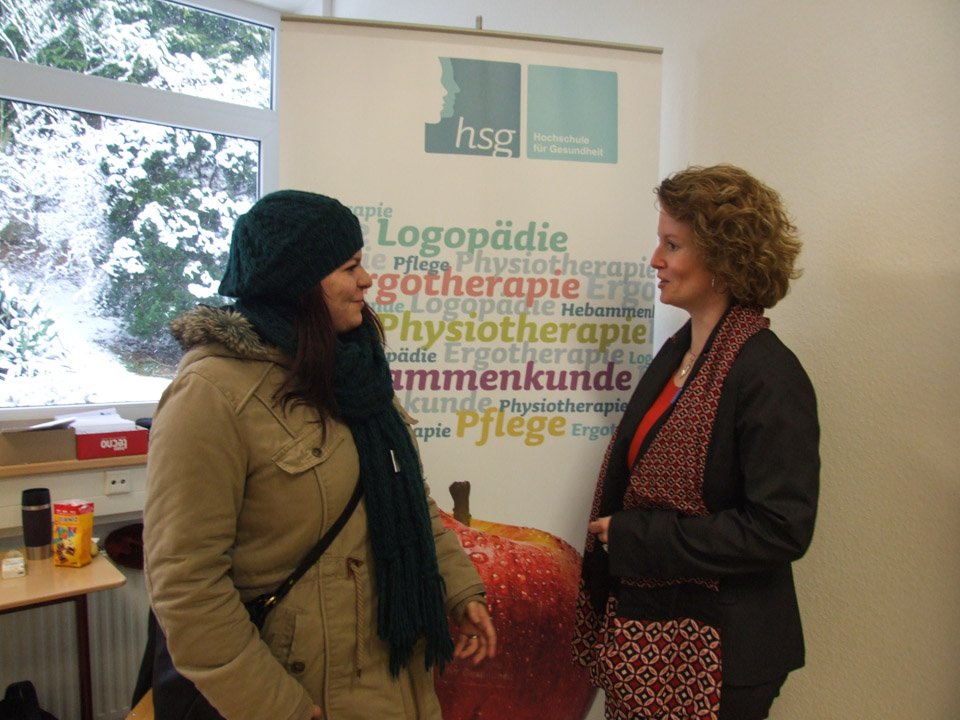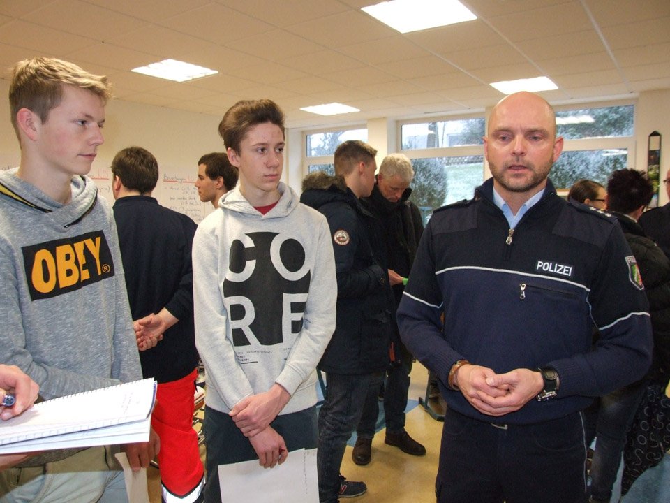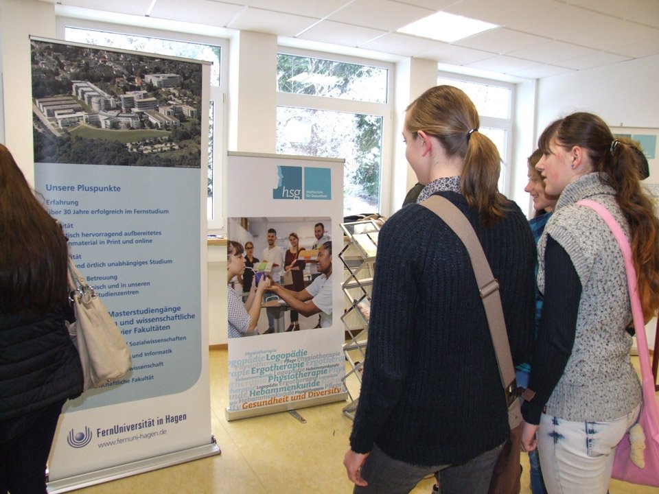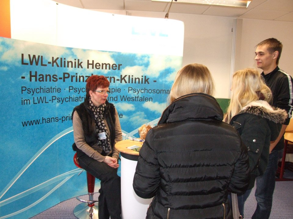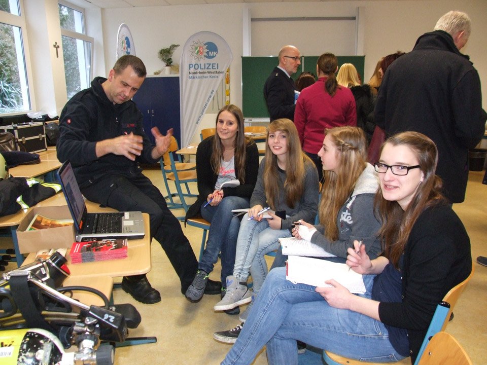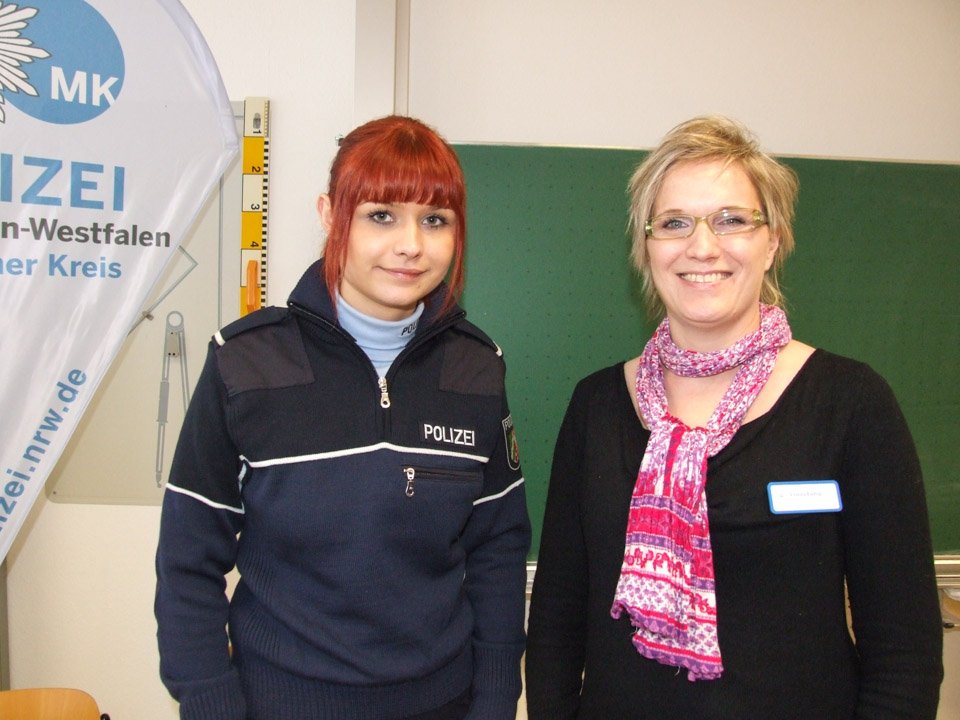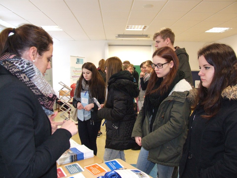 „Wir vermissen die Schule“, erklärten beispielsweise Anna Heinisch und Felina Fälsch, die 2014 ihr Abitur gemacht hatten. „Wenn man nicht mehr am Placida ist, dann weiß man erst, was hier für einen getan wird“, betonte Monja Bohlmann, die 2013 ihr Fachabitur gemacht hatte und nun Polizeikommissar-Anwärterin bei der Kreispolizei ist. In dieser Funktion gehörte sie zu den vielen Ausstellern, die ins „Placida“ gekommen waren, um die derzeitigen Schüler über ihre Zukunftschancen zu informieren. Dazu zählten beispielsweise auch die Feuerwehr, die Gesundheitsakademie SMMP, verschiedene Krankenkassen, Einrichtungen der Behindertenhilfe, die Arbeitsagentur, die Stenden Hogeschool, die Fernuni Hagen, die Fachhochschule Südwestfalen und viele mehr. Mit dabei war zudem die Hochschule für Gesundheit (HSG) in Bochum, wo Leonie Wright, die 2008 ihr Fachabi am „Placida“ machte, nun Gesundheit und Diversity studiert. Damit kann sie später in verschiedenen Einrichtungen arbeiten. Schon immer hatte Leonie Interesse am Thema Gesundheit, besuchte deshalb das Placida-Viel-Berufskolleg: „Wer am Placida lernt, hat die beste Grundlage, um später zur HSG zu gehen.“