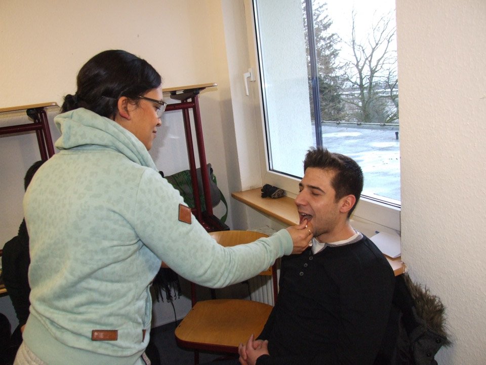 Gero Sauer, Heilerziehungspfleger an der Kinderheilstätte Nordkirchen, vermittelte das Konzept anhand von Filmen, Vorträgen und praktischen Übungen. So stellte er beispielsweise verschiedene Lebensmittel, von Ketchup bis Brause, zur Verfügung, mit Wattestäbchen mussten sich die angehenden Heilerziehungspfleger gegenseitig die Lippen oder Zunge bestreichen und herausfinden, was sie denn da gerade schmeckten.