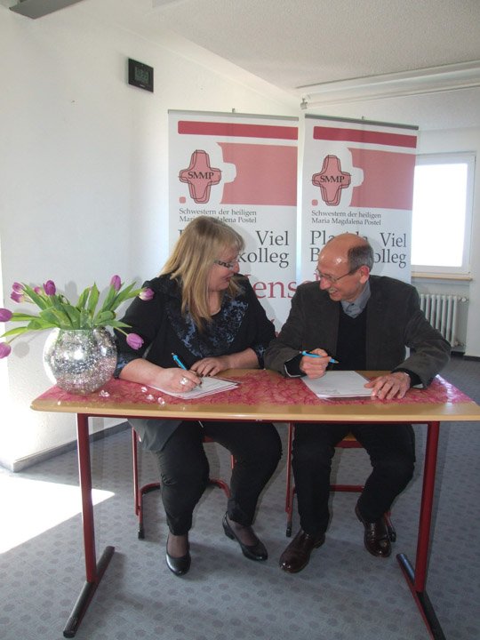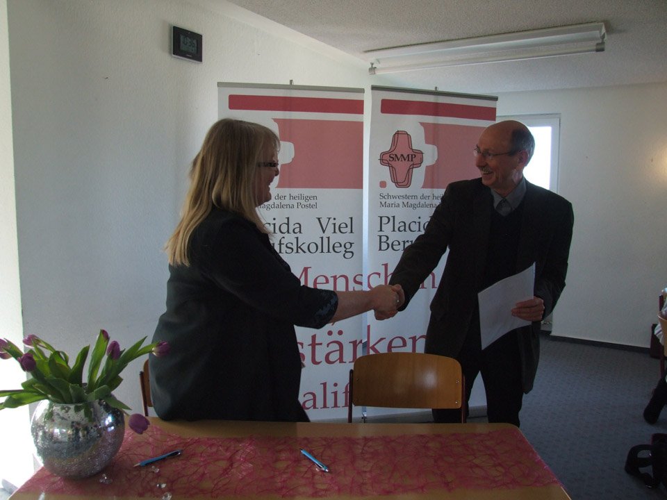 Das zeigt: „Schule ist mehr als Unterricht“, wie Gaby Petry betont. „Damit zeigt das Placida-Viel-Berufskolleg Flagge hier in der Region.“ Für Dechant Jürgen Senkbeil kommt das Engagement der Schule wie gerufen. Schließlich suche man neue Ideen, um Glauben leben zu können, und damit auch neue pastorale Orte und Gelegenheiten. „Das Berufskolleg ist ein pastoraler Raum, wo Glauben gelebt wird.“ Das wurde ihm bei einem Rundgang durch die Schule in Trägerschaft des Ordens der Schwestern der Heiligen Maria Magdalena Postel deutlich. Obwohl Schüler aller Konfessionen aufgenommen werden gibt es regelmäßige Gottesdienste, in jedem Raum ein Schulkreuz und viel soziales Engagement. „Wir sind gemeinsam auf dem Weg“, sagten Petry und Senkbeil und leisteten ihre Unterschriften unter die Verträge.