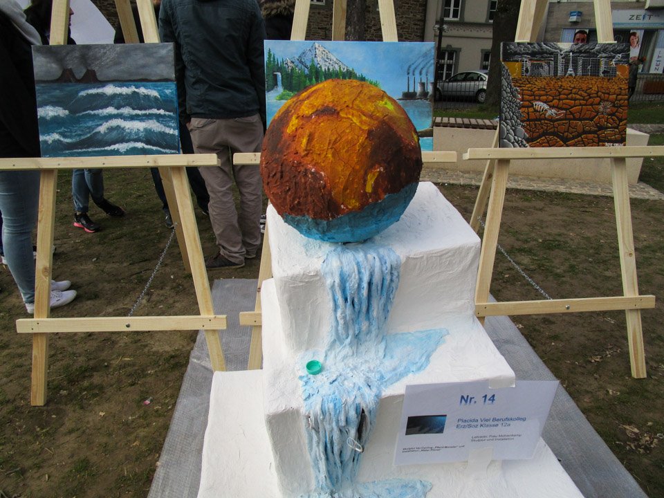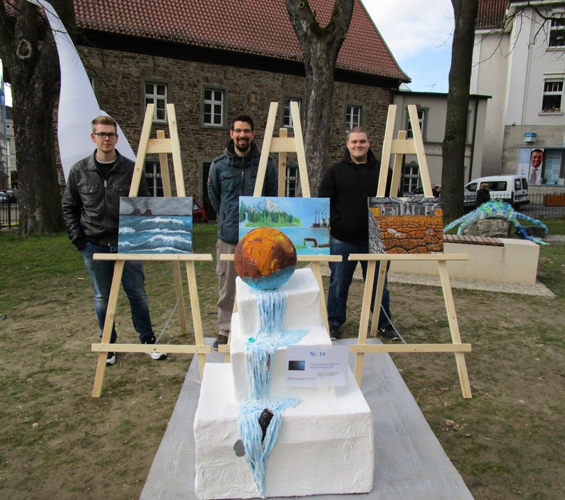 Rene Schewell erklärte eine Trilogie aus drei Bildern (Öl und Acryl), die mit einer Weltkugel-Skulptur die Geschichte des Wassers und den Einfluss des Faktors Mensch darstellte. Die Skulpturen hatte die Klasse gemeinsam im Unterricht gefertigt, die Bilder malten sie Zuhause.