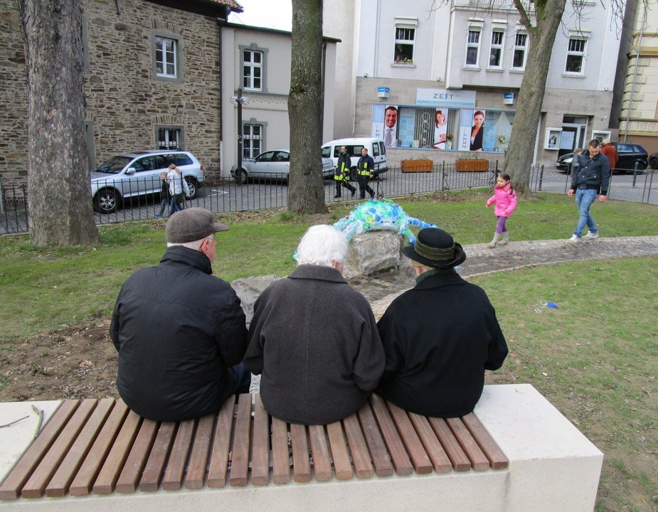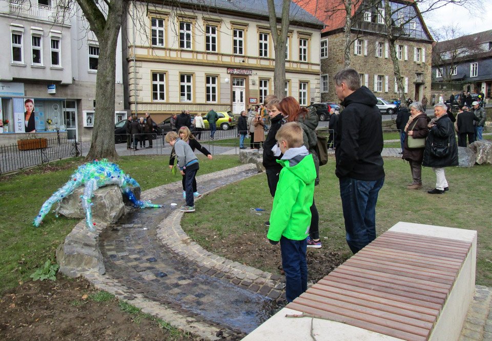Die 12a gestaltete das Kunstwerk, das bei der Präsentation beim Stadtfest zur Eröffnung des Baches am Sonntag wohl die größte Aufmerksamkeit bei den jungen Besuchern fand: Eine Seeungeheuer-Skulptur, die in der Nähe des Beginns des offen gelegten Baches am Kirchplatz positioniert wurde. Gefertigt nur aus Draht und alten PET-Flaschen schimmerte es in Wasserfarben und symbolisierte die Zerstörung des Wassers (vor allem der Weltmeere) durch die ins Meer gekippten Müllberge. „Ein Seeungeheuer, das die Menschen selbst geschaffen haben“, betonte Schülerin Vanessa Biermann.