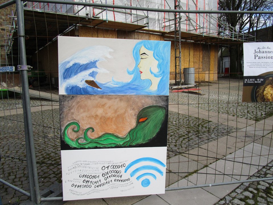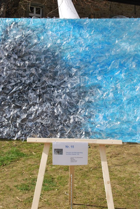 Bilder schuf auch die 12b. Ein Bild, ebenfalls mit auseinander geschnittenen PET-Flaschen bestückt, passte wunderbar zum Thema des Wettbewerbs. Britta Welschhoff bezog den Wettbewerbs-Titel „Alles im Fluss“ auch auf den modernen Datenfluss, den sie in ihren Bildern „Die Welle“ darstellte.