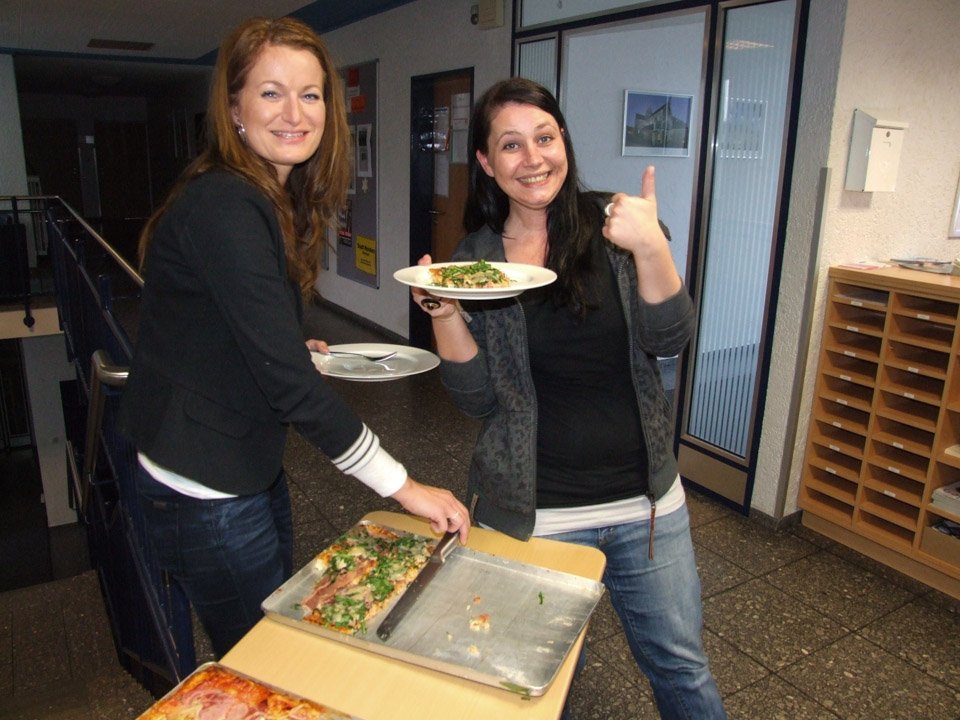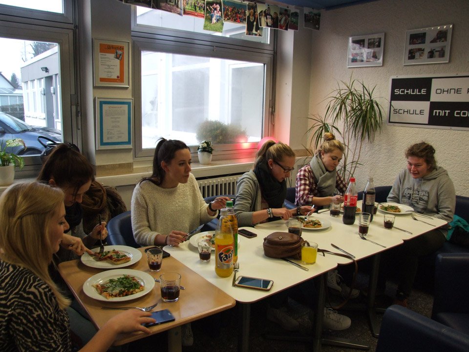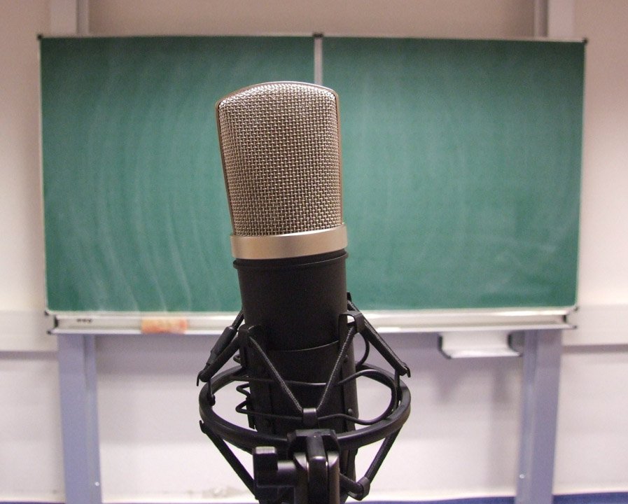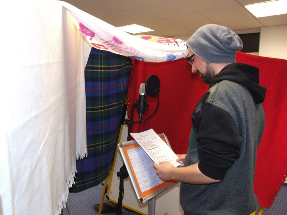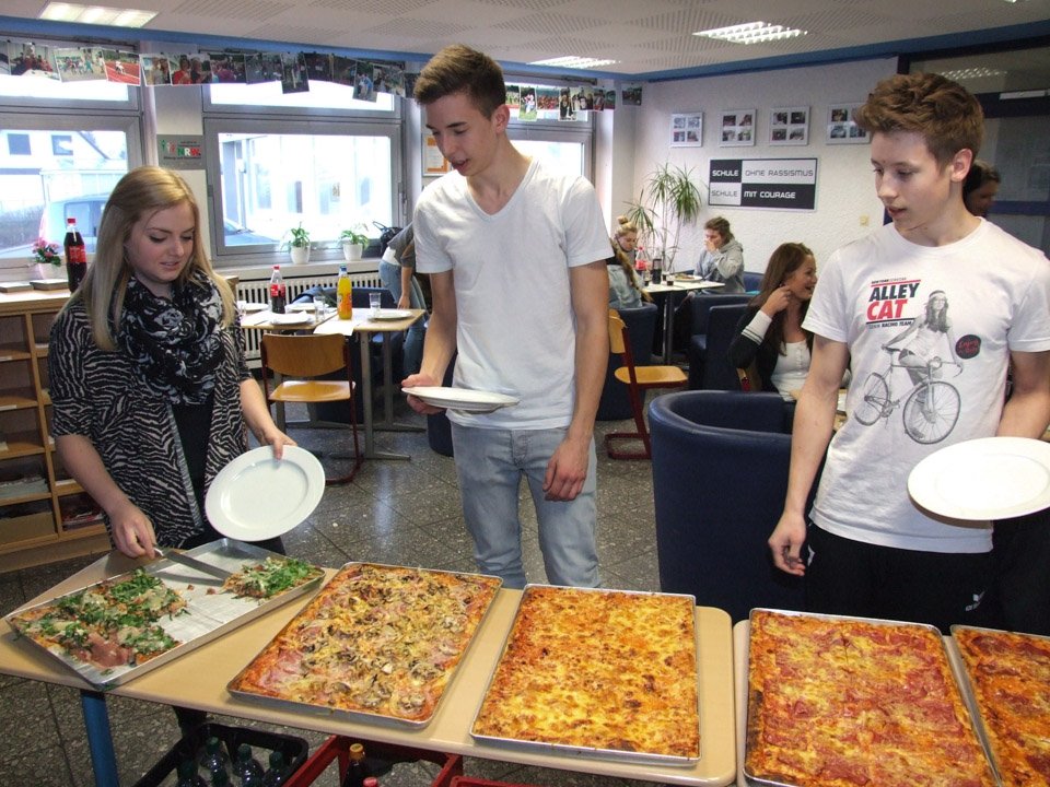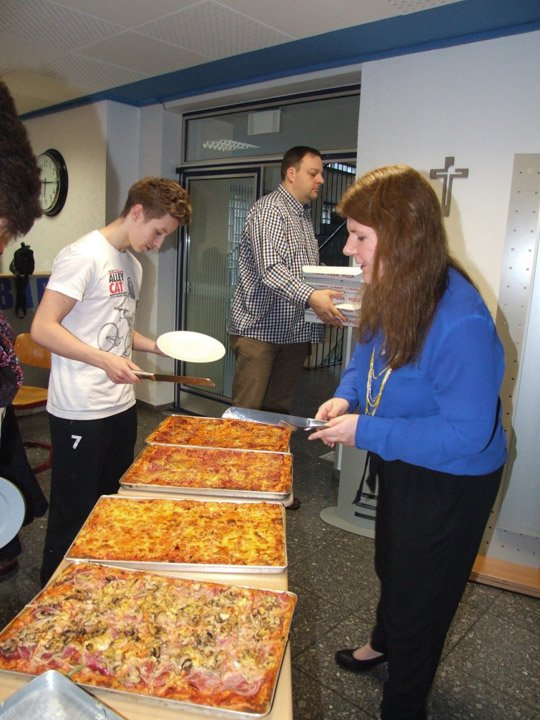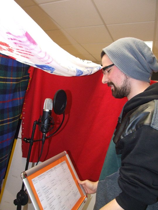 Nach einer Stärkung mit von der Schule gesponserten Pizzas, einem letzten Bearbeiten der Texte und Probe-Lesungen startete dann die Aufnahme. Vorher gab es Anweisungen vom Aufnahme-Profi: Handys aus, auch bitte nicht auf Vibration. Der richtige Abstand zum Mikro musste eingehalten werden. Und vor allem: Deutlich langsamer sprechen als sonst. Vorher noch aufgeregt kichernde Schüler wurden auf einmal still, arbeiteten zügig und hochkonzentriert. Vor allem Riccardo Giuffrida (AHR 12a) hatte viel zu tun, er ist sozusagen der Moderator.