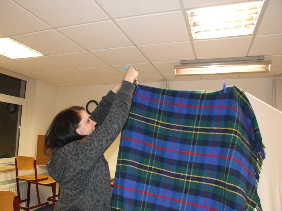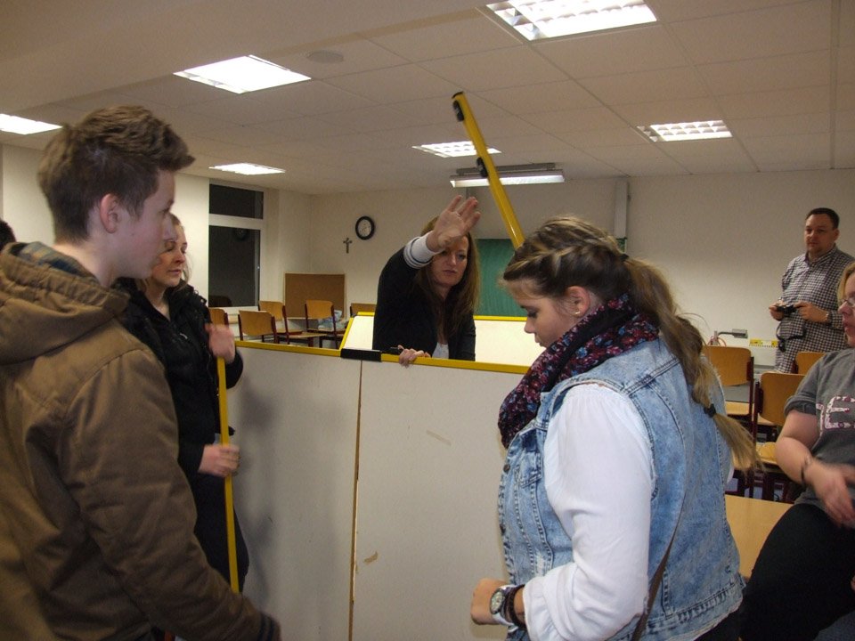Und so kam es, dass in einem Klassenraum mit Teppichboden mit Hilfe von Stellwänden, Decken und Wäscheklammern eine Art Mikrofonkabine aufgebaut wurde. Sebastian Adler, seines Zeichens begeisteter Hobby-Tontechniker, und Andre Quante-Blankenagel, Diakon der St.-Vincenz-Gemeinde, waren abends ins Berufskolleg gekommen. Während Sebastian Adler seine Ausrüstung aufbaute, unterhielt sich der Diakon mit den Jugendlichen. Janin Bastian aus der KI-U macht gerne bei religiösen Projekten an der Schule mit, findet die Kreuztracht äußerst spannend. Während Vanessa Biermann (AHR 12a) schon seit Jahren vor Ort kirchlich aktiv ist und schon oft bei der Jugendkreuztracht mitgelaufen ist, ist es für Klassenkameradin Laura Gawlik eine Premiere: „Ich kannte so etwas gar nicht, deshalb ist es schön, das mal mitzumachen. Erst recht, wenn man die Texte spricht und zum Teil selbst schreibt, das bringt einen nah dran ans Geschehen.“ Auch Vanessa ist gespannt darauf, wie es sein wird, die eigenen Texte durch eine Lautsprecheranlage zu hören.