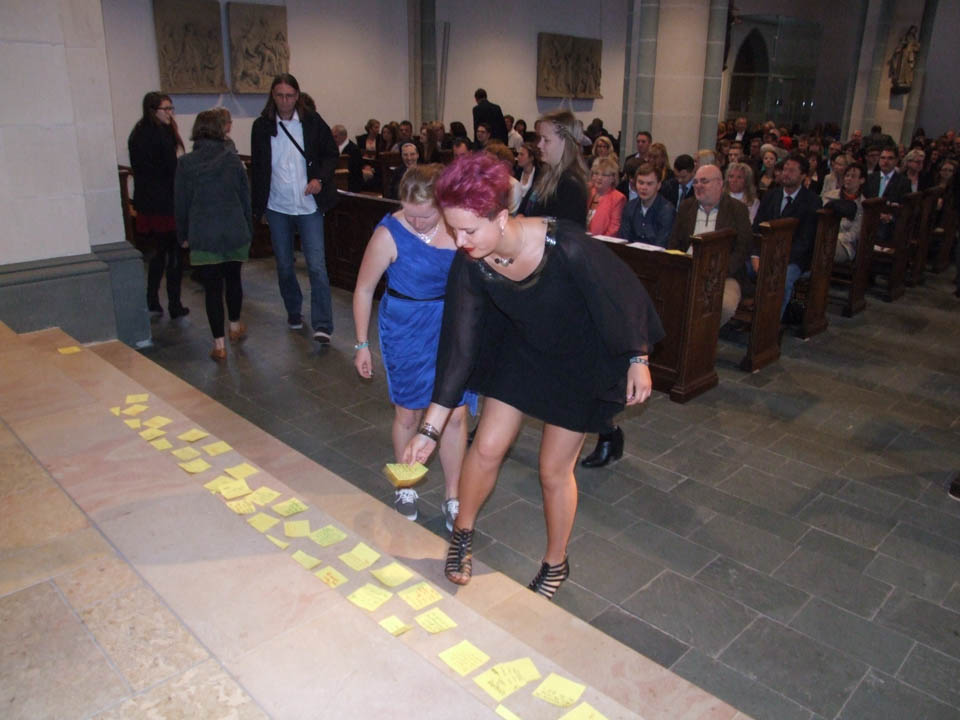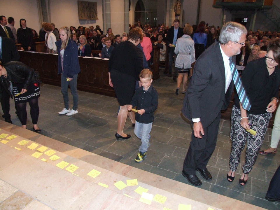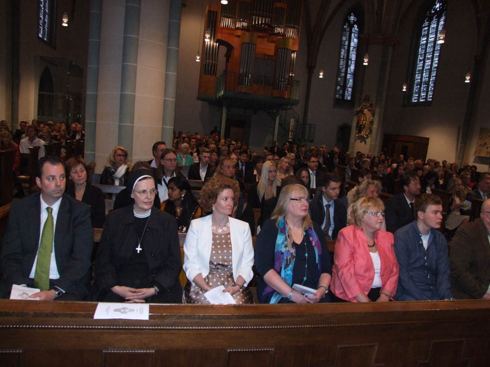 Der Tag begann mit einem von Schulseelsorgerin Anne Junker in der St.Vinzenz-Kirche gestalteten Wortgottesdienst unter dem Motto „Neue Wege entstehen dadurch, dass man sie geht“. Die neue Generaloberin der Schwestern der Heiligen Maria Magdalena Postel und bisherige Schulleiterin des Walburgis-Gymnasiums Schwester Maria Thomas Dikow übermittelte Glückwünsche ihrer Schulen und des Ordens. Sie wünschte den Absolventen, Grenzen zu überwinden – sowohl die Grenzen in sich selbst, als auch politische Grenzen und vor allem die Grenzen zu anderen Menschen.