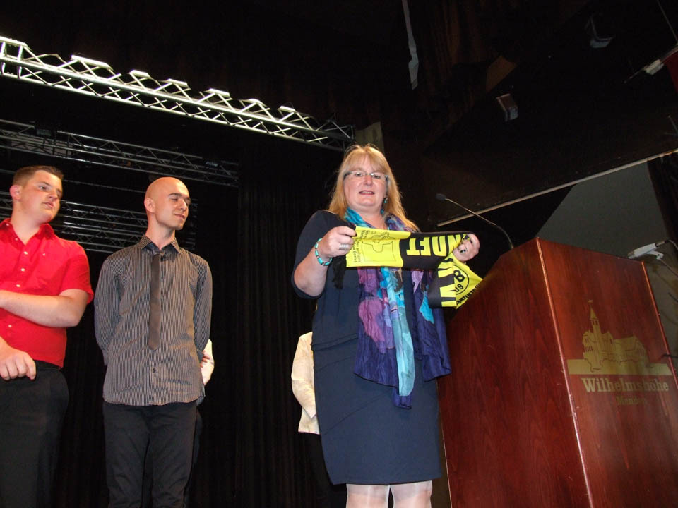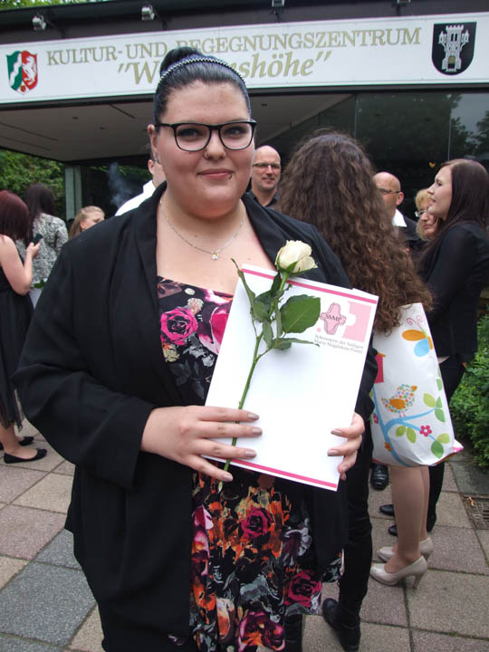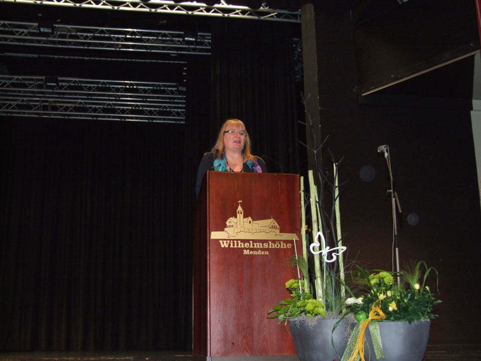 Weiter ging das Programm dann auf der Wilhelmshöhe. Schulleiterin Gaby Petry gab dem Motto der Abschlussfeier folgend ihrer Hoffnung Ausdruck, „dass wir Sie, liebe Absolventinnen und Absolventen, darin bestärken konnten, den für Sie richtigen Weg zu finden“. Andreas Reichert als Vertreter der Geschäftsführung dankte den Eltern „für Ihr Vertrauen in unsere Schule“ und wünschte den Schulabgängern gute soziale Beziehungen, den Glauben an Werte und Normen und eine aktive Gestaltung des Lebens. Der 1. Beigeordnete der Stadt Menden Sebastian Arlt wies auf die Verantwortung in Berufen im Sozial- und Gesundheitswesen hin. „Stellen Sie sich immer die Frage: Wie sollen die Menschen mich in Erinnerung behalten?“