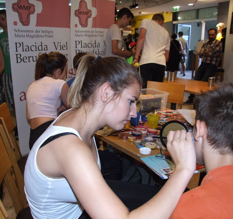 Danach wechselten sich die Schülerinnen und Schüler mit der Betreuung des „Placida“-Standes in der ersten Stadion-Etage ab. Kinderschminken, Dosenwerfen und andere Spiele wurden geboten, Klassenlehrer Dr. Martin Meise und Martha Gaczynski informierten Interessierte auch gerne über das Berufskolleg, das Kooperationspartner des BVB-Lernzentrums ist.