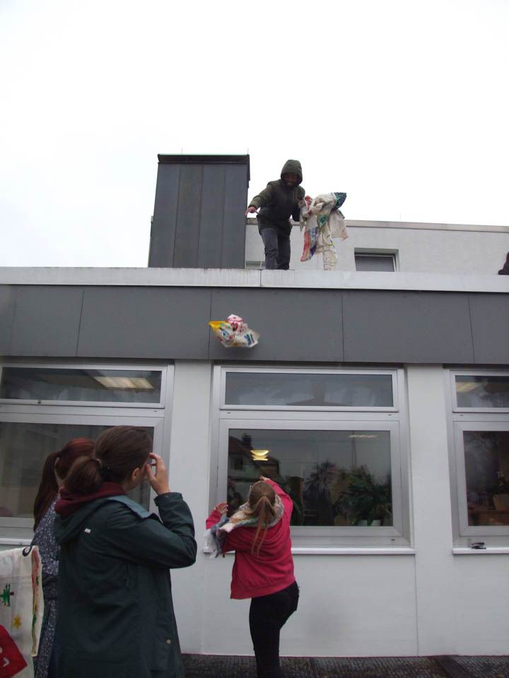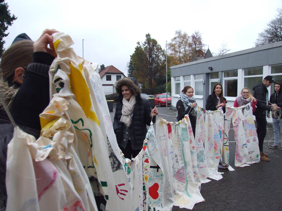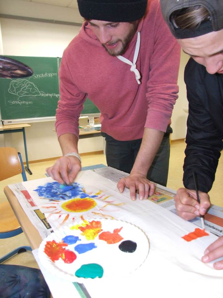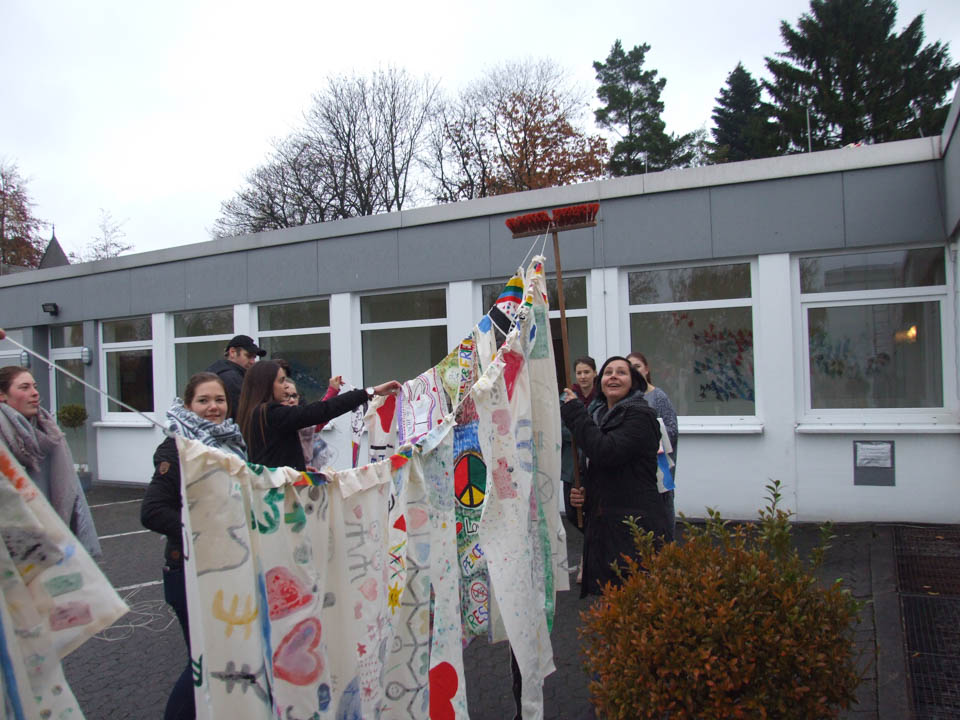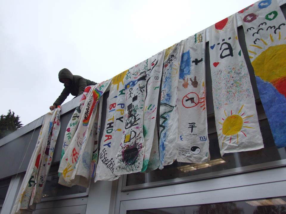 Zurück in der Schule schöpften die Schüler Kreativität aus dem gerade Gesehenen. In Kleingruppen gestalteten sie Fahnen, die ausdrückten, was für sie das Leben schön macht. Mit Acrylfarbe gingen alle ans Werk und drückten so mit Motiven, Versen, Farben und Formen ihre Vorstellungen, Gefühle und Wünsche aus. „Frieden“, „Familie“, Freundschaft und Gemeinschaft“, der liebste Sportverein, ein Regenbogen – viele schöne Dinge findet der Betrachter auf den Fahnen.