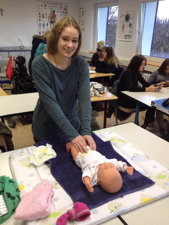 Einige hatten in punkto Wickeln schon Vorerfahrung, doch „mit einem echten Baby geht das besser“, da waren sich alle einig. Nun absolvieren sie erst einmal ein dreiwöchiges Familienpraktikum, in dem sie dann echte Säuglinge wickeln können.