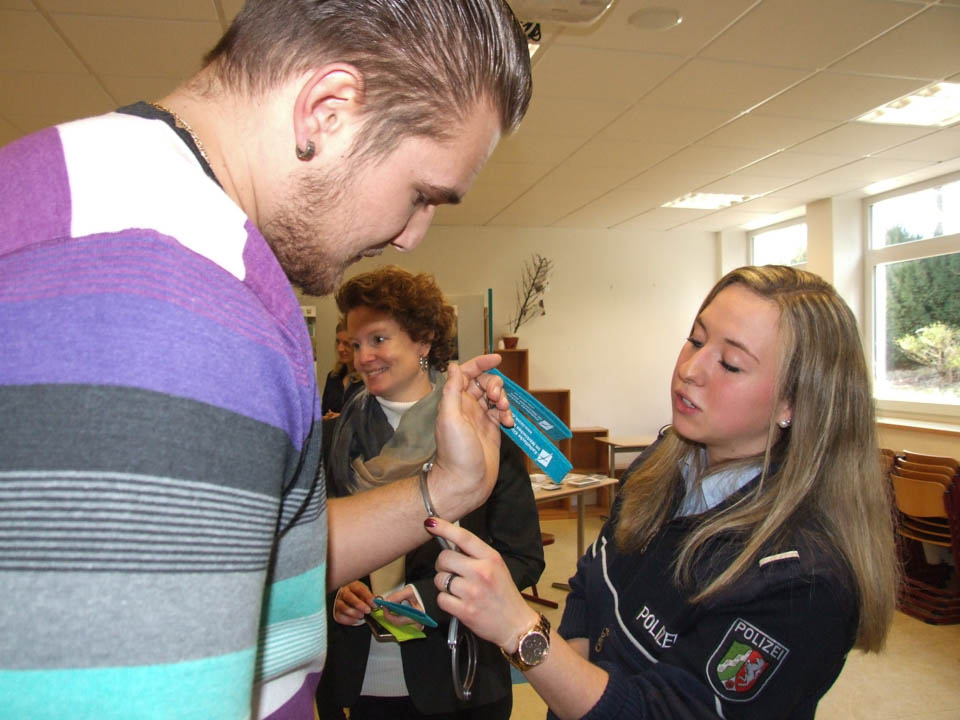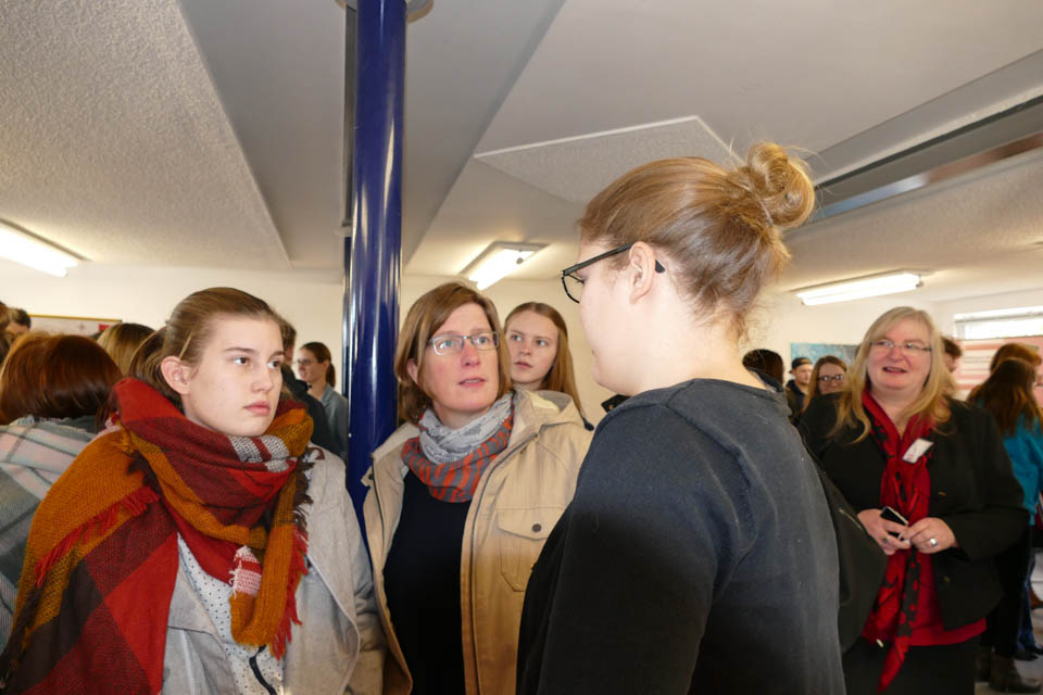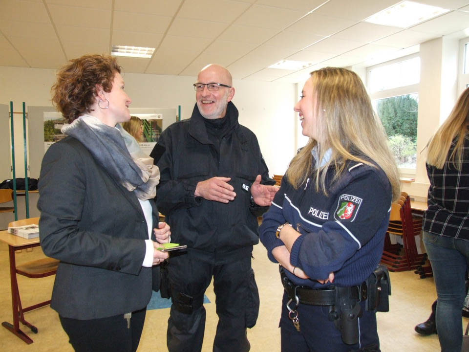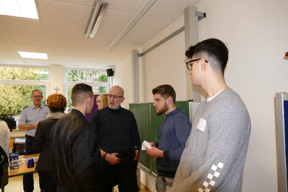 Schulleiterin Gaby Petry und ihre Stellvertreterin Kerstin Kocura hatten deshalb zu Beginn auch eine große Begrüßungsrunde zu absolvieren, es waren zahlreiche Aussteller gekommen, die ihr Angebot darstellten. Und in vielen Räumen war Gaby Petry freudig erstaunt, dass bei den Ausstellern mittlerweile viele ehemalige „Placida“-Schülerinnen und –Schüler arbeiten. Bei der Polizei NRW beispielsweise stellten mit Monja Bohlmann und Sabrina Urban gleich zwei Ehemalige ihr Bildungsangebot vor. „Ich habe mich extra für den Tag gemeldet, ich wollte so gerne wieder einmal hier vorbeischauen“, erzählte Sabrina. Nebenan bei den Katholischen Kliniken im Märkischen Kreis machen derzeit unter anderem Vanessa Pinto Lemos und Jason Pazdzior ihre Ausbildung – ebenfalls Ehemalige vom „Placida“. Gerne erfuhr Gaby Petry von den Arbeitgebern, wie gut ihre ehemaligen Schützlinge sich machen. Der StuBo-Tag ist eben ein wichtiger Termin für die Betriebe aus der Umgebung.