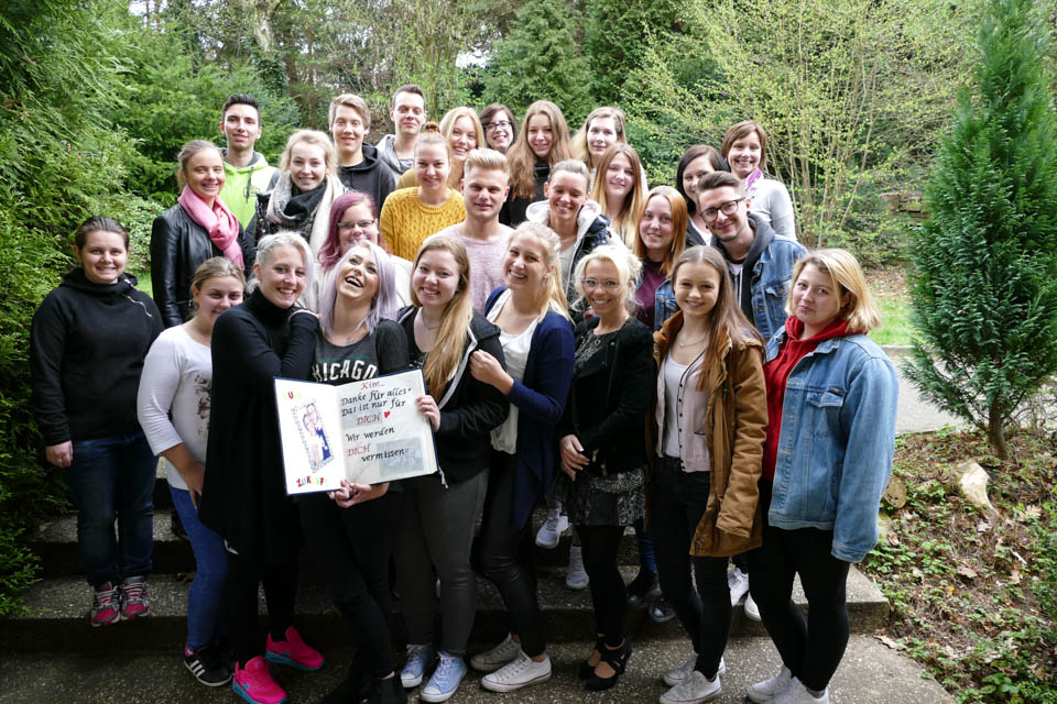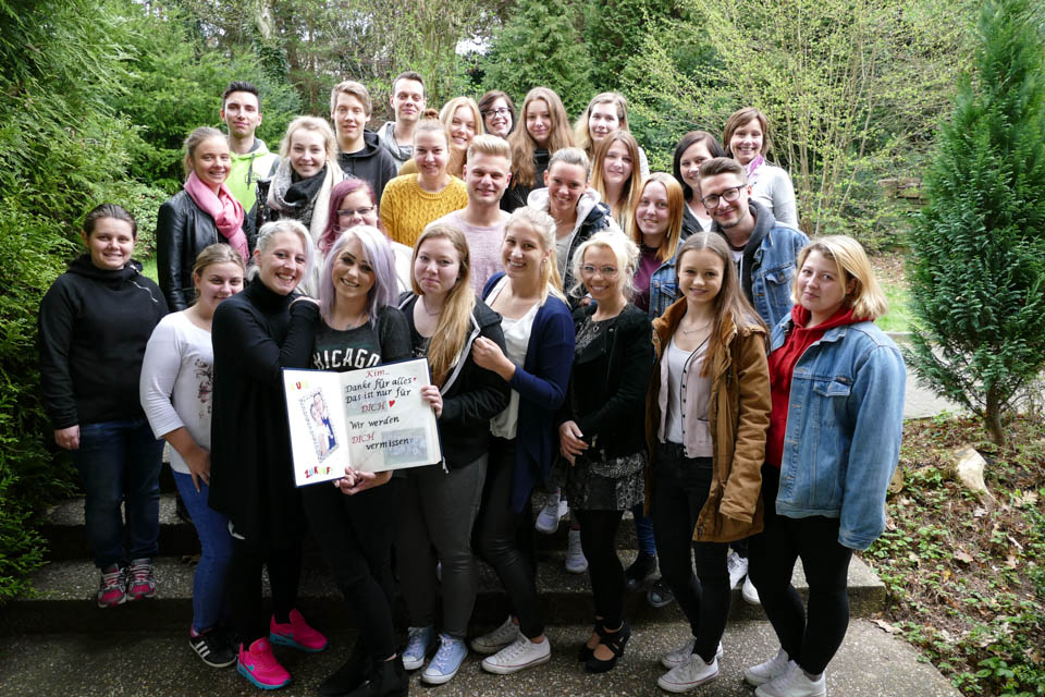 Irina Rebbe sowie Klassenlehrerin Marzena Schweda und Fachlehrerin Katja Hofbauer (die Kim in allen drei Bildungsgängen unterrichtet hatte) kamen zur Abschiedsfeier in die Erzieher-Klasse. Kims Klassenkameraden hatten ein Frühstück vorbereitet – und Geschenke. Stefanie Schmidt, die gemeinsam mit Kim und Nilsen Pott die vielseitige Schullaufbahn bisher durchlaufen hat, überreichte ein dickes Album. Darin hatten die anderen Studierenden und viele Lehrer Texte und Fotos eingeklebt: schöne Erinnerungen und liebe Wünsche. Nilsen hielt sogar eine kleine Rede: „Wir verlieren nicht nur eine Klassenkameradin, sondern eine gute Freundin.“
