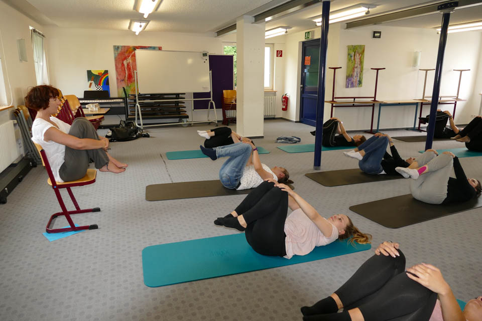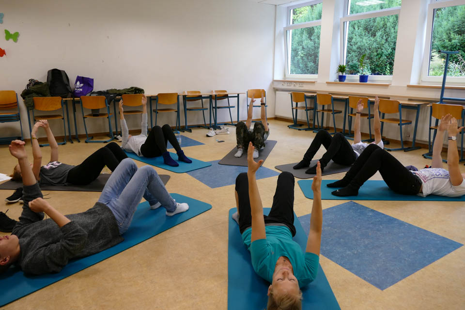 18 verschiedene Workshops wurden von Lehrern und externen Referenten angeboten, je zwei konnten die Schüler belegen. Madita Dransfeld, Studierende der Erzieher-Ausbildung, war hinterher total begeistert vom Shiatsu-Workshop, bei der sie mit ihrer Freundin Stefanie Schmidt Druckmassage lernte. „Das war richtig gut, ich bin fast eingeschlafen, so entspannt war ich.“ Ähnliches erlebte Klassenkamerad Philipp Gutjahr bei dem Angebot „Traumreise“: „Ich habe 45 Minuten lang wunderbar geschlafen wie ein Stein.“ Für entspannte Momente sorgte auch die Mendener Yogalehrerin Andrea Stanzel.