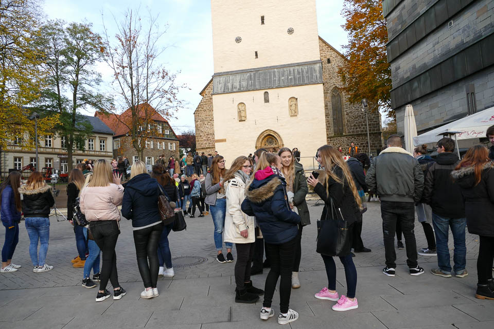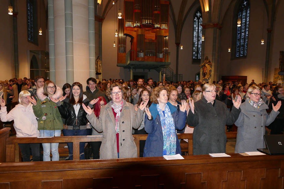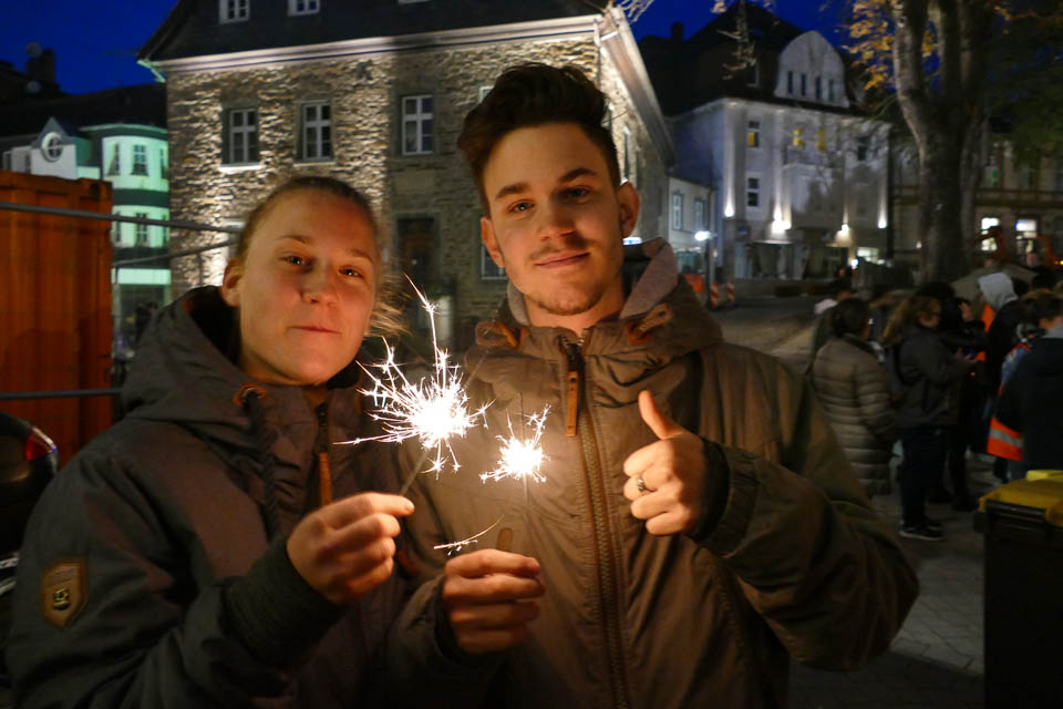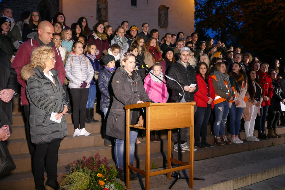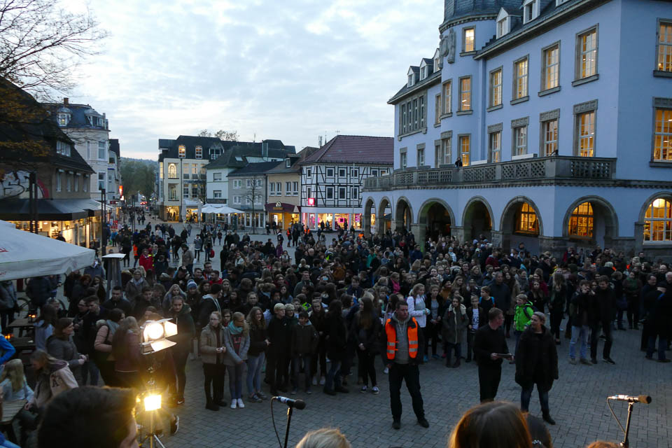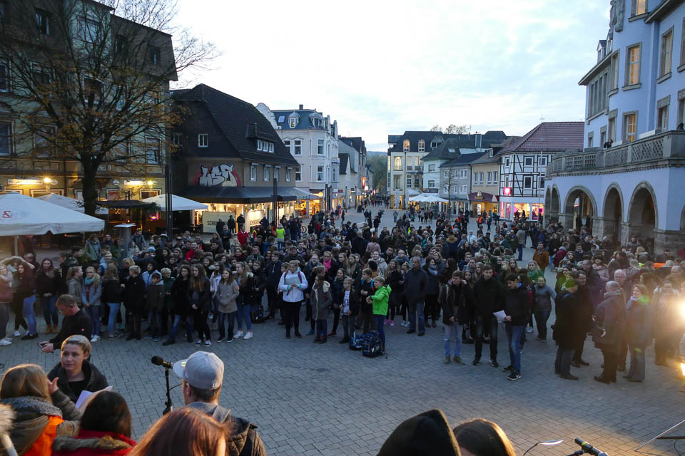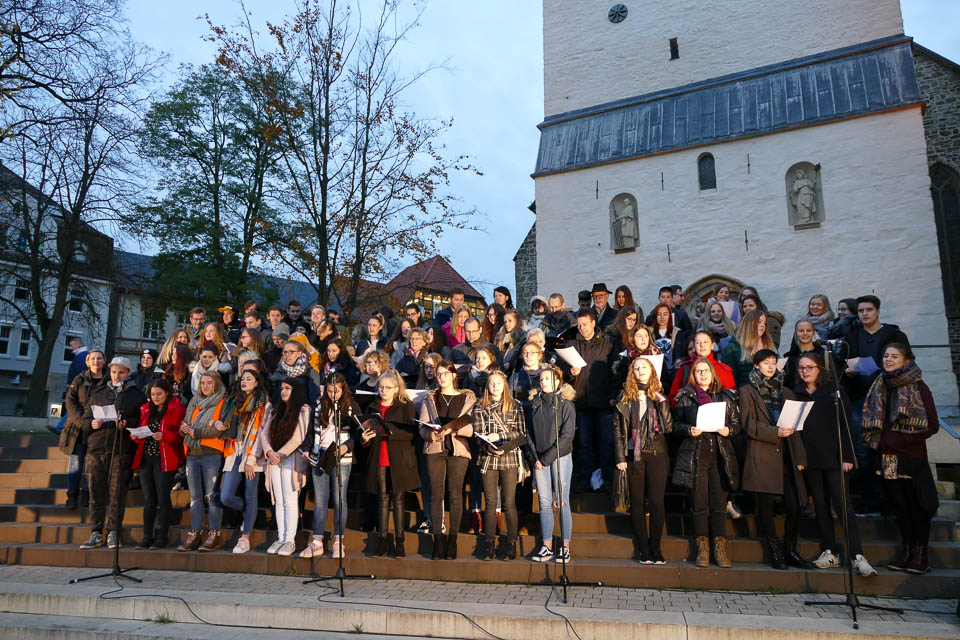 Dann ging es hinaus auf den Platz vor der St.-Vincenz-Kirche, wo sich in der Abenddämmerung bereits Hunderte von Menschen, darunter auch viele Schüler der weiterführenden Schulen in Menden, versammeltet hatten. Ein großer Chor mit Vertretern aller Schulen sang „Augen auf“ von Sarah Connor – dabei strahlte Irina Rebbe glücklich, schließlich hatte sie wochenlang mit den „Placida“-Schülern geübt.