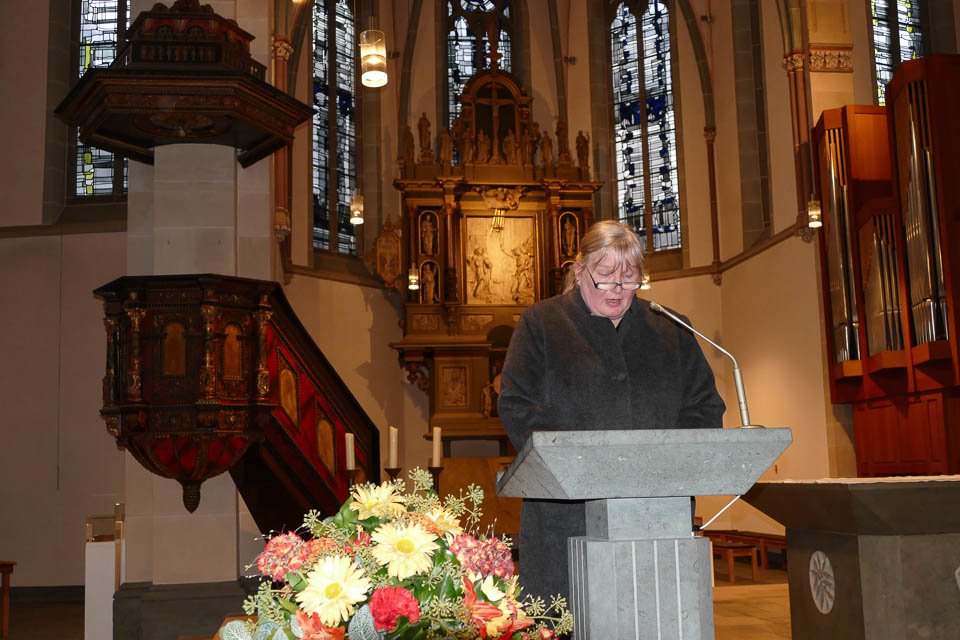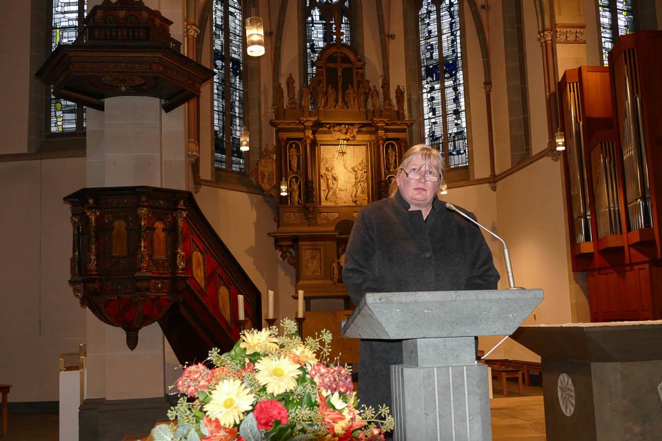 Gaby Petry leitete den Gottesdienst mit dem zurzeit auf Twitter meistgelikten Zitat von Nelson Mandela ein: „Niemand hasst von Geburt an jemanden aufgrund seiner Hautfarbe, seiner Herkunft oder seiner Religion.“ An die traurige Aktualität des Themas erinnerten auch Chantal Köhler und Sabine Jasperneite mit einer Präsentation, bei der historische und aktuelle Ereignisse verglichen wurden: Auf der Straße sterbende Menschen im Warschauer Ghetto und der Rentner, der sterbend auf dem Boden einer Bank von anderen Kunden ignoriert wurde. Judenhetze und AFD-Plakate. Zuzugssperren nach dem Zweiten Weltkrieg und „Refugees go home“-Plakate heute.