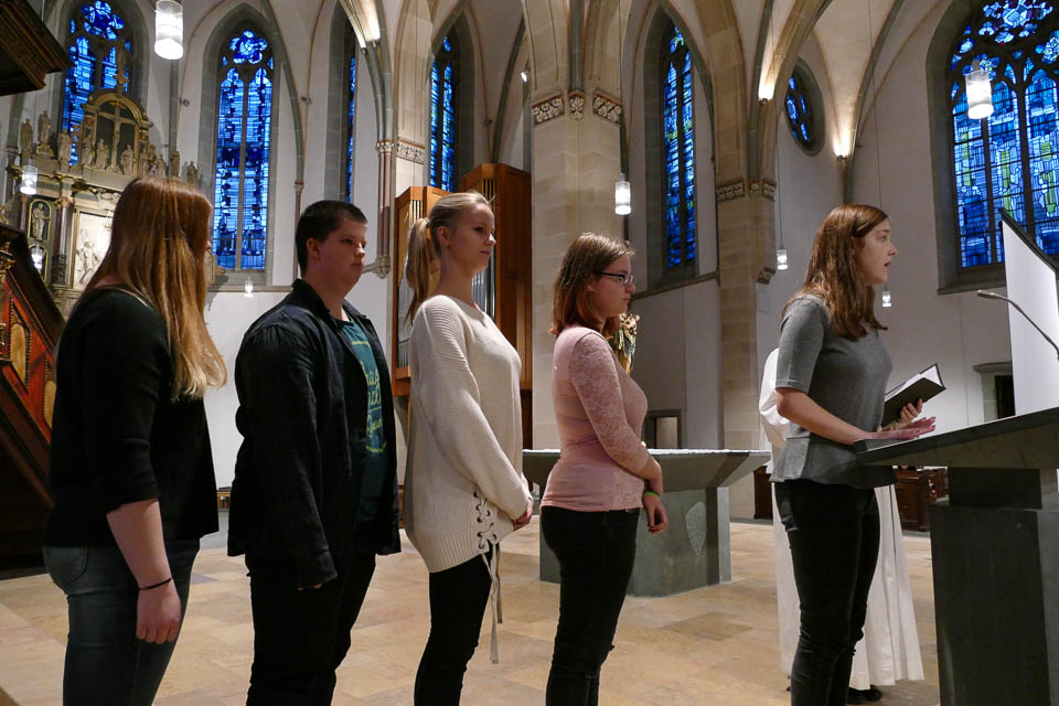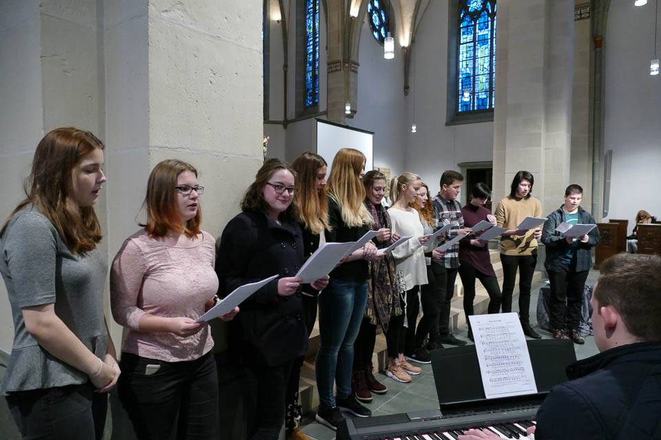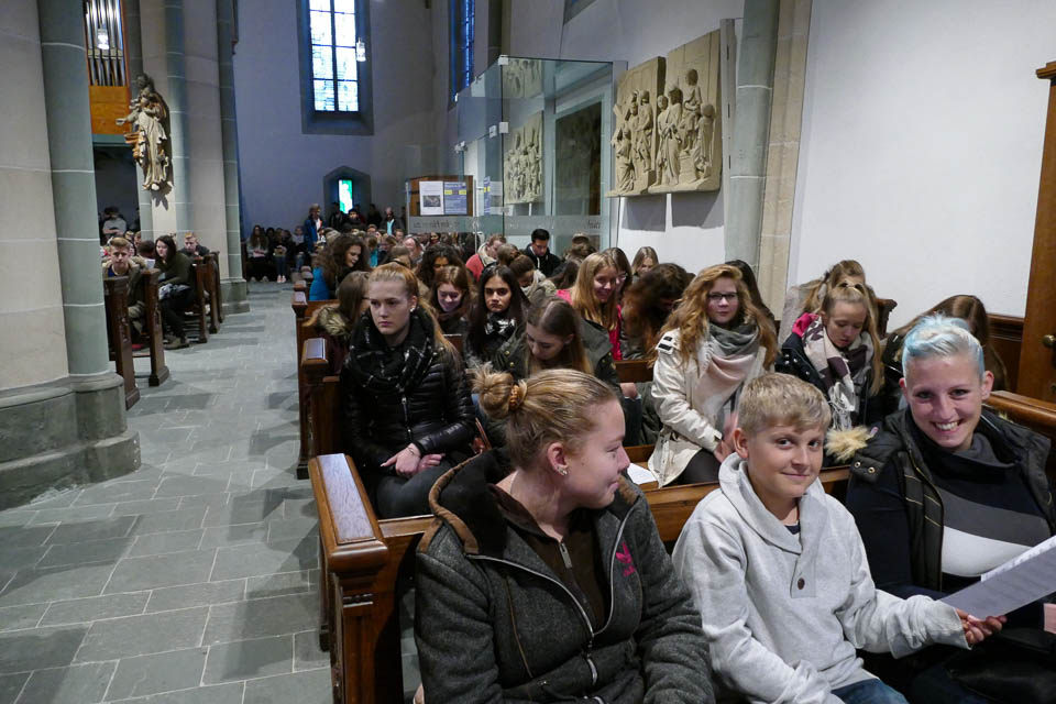 Das Berufskolleg begann diesen Abend mit einem Gottesdienst in der St.-Vincenz-Kirche, um die Schüler thematisch zu den schrecklichen Ereignissen im Jahr 1938 hinzuführen. Vorbereitet hatten ihn Chantal Köhler und Gemeindereferentin Sabine Jasperneite gemeinsam mit Schülern.