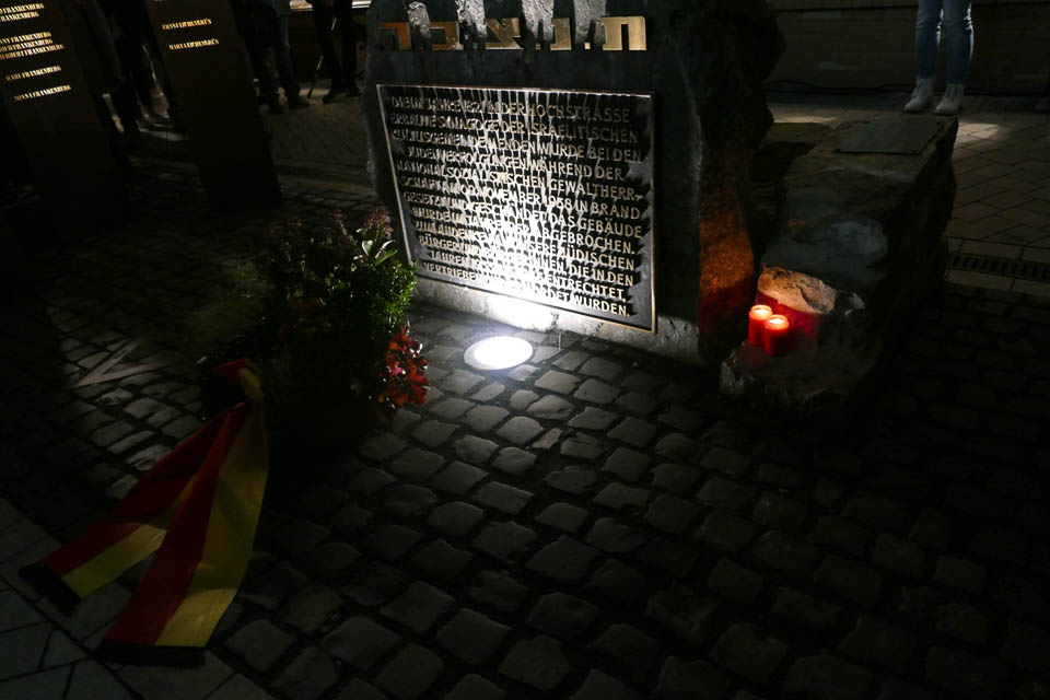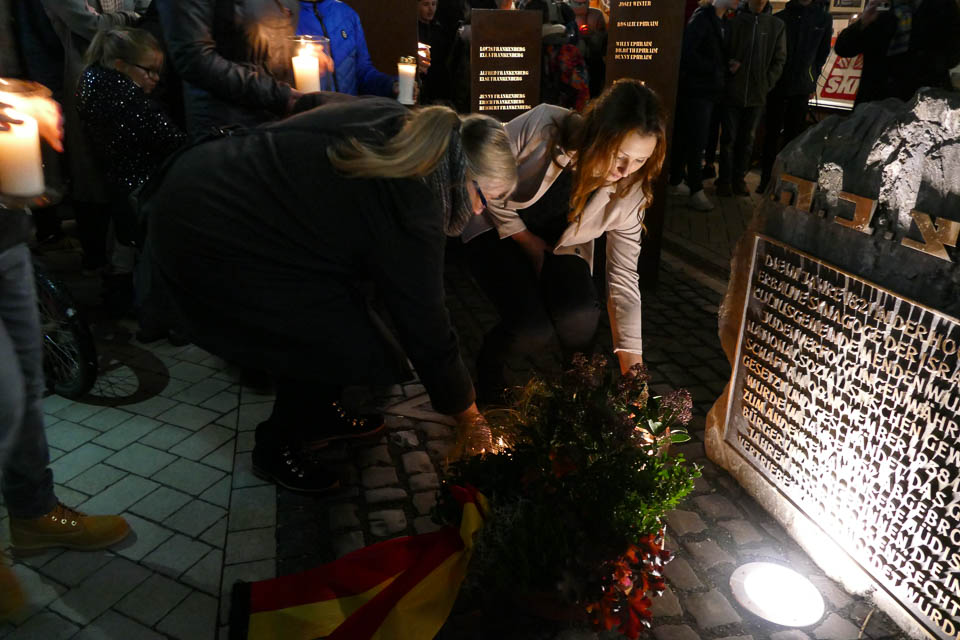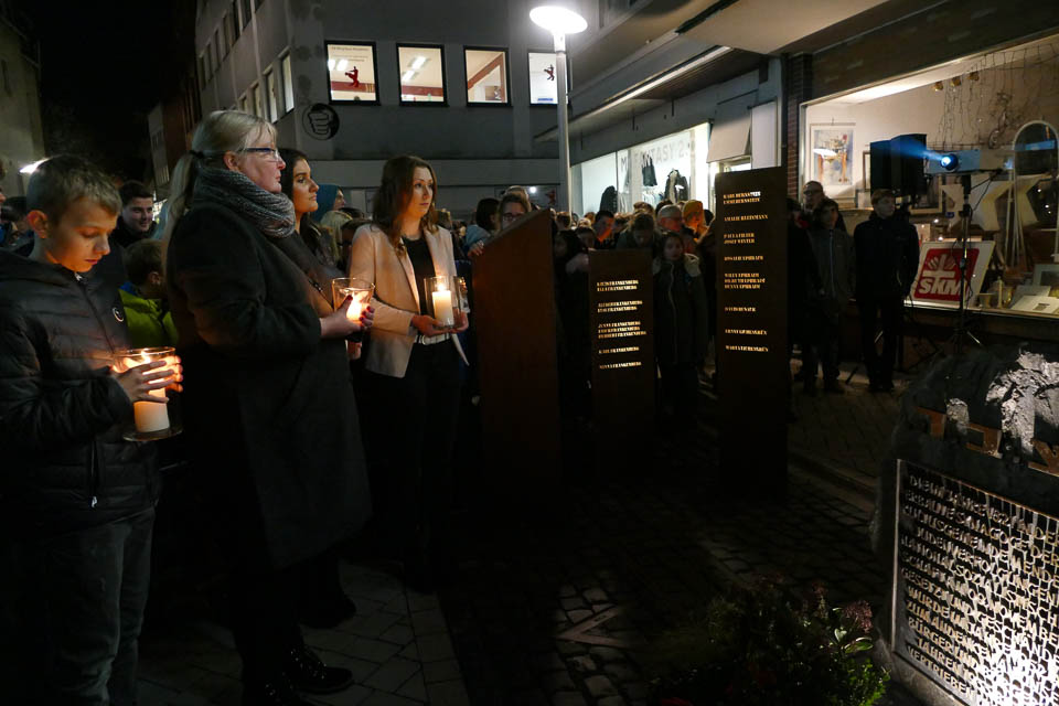 Und dann zündeten alle mitgebrachte Kerzen, Laterne oder Wunderkerzen an und gingen langsam durch die Innenstadt, deren Schaufenster extra mit Kerzen beleuchtet waren. Endpunkt war das Mahnmal an der Hochstraße, wo Bürgermeister Wächter gemeinsam mit den „Placida“-Schülern Leon Rostek und Jonas Frai einen Blumenkranz niederlegte. Dort gedachten alle dann den Mendener Opfern des Holocaust, deren Namen alle laut vorgelesen und an eine Hauswand projiziert wurden.