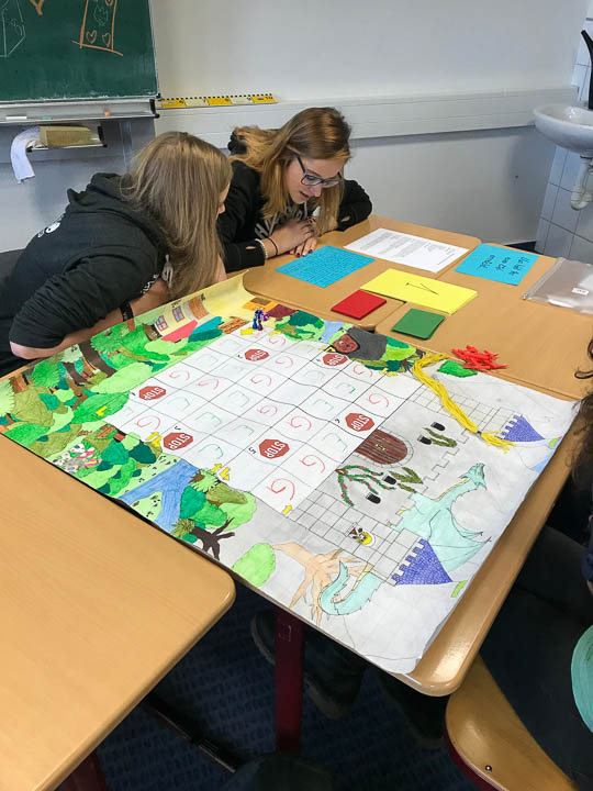 Die Grundidee für das Spielfeld war bei dieser Aufgabe vorgegeben. Schränkte das die Ideen der Schüler ein? Die Antwort lässt sich mit einem Blick auf die aufwendige Gestaltung und die Einzigartigkeit der Spiele erschließen. Die AH12b1 zeigte wieviel man mit Materialien wie Würfeln und Spielfiguren erschaffen kann.