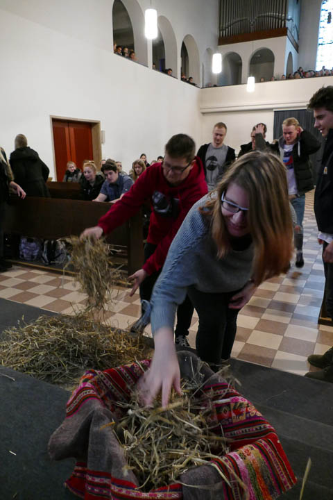 Nachdenken sollten die Anwesenden aber auch einmal ausdrücklich über ihre gute Taten. Chantal Köhler lud sie ein, eine einer Krippe nachempfundene Kiste vor dem Altar mit Stroh als Symbol für ihre Taten zu füllen – gemäß einem alten Adventsbrauch. Die Kiste füllte sich schnell.