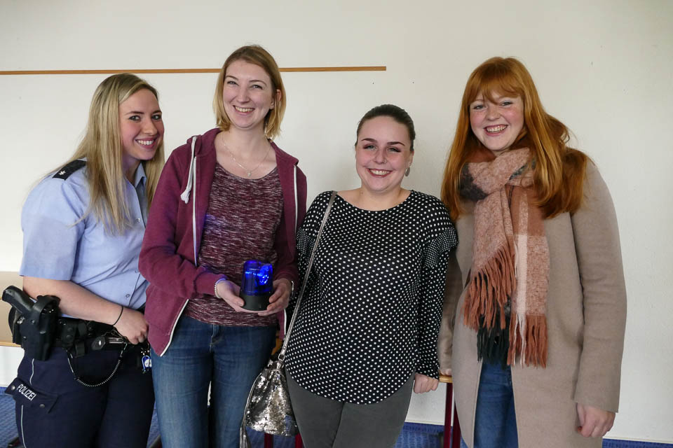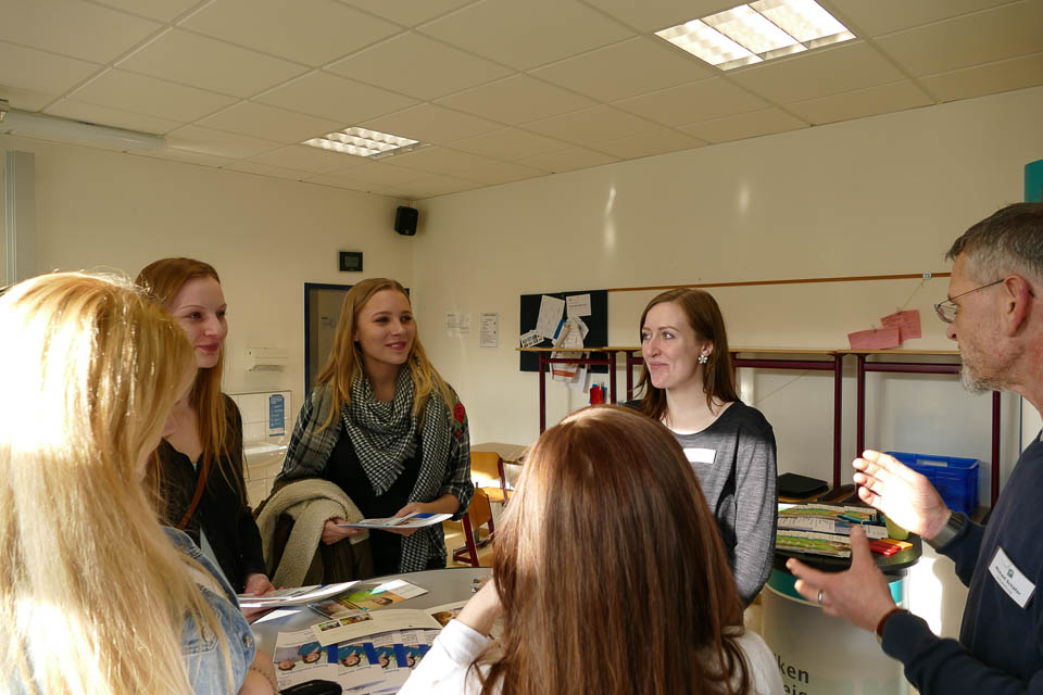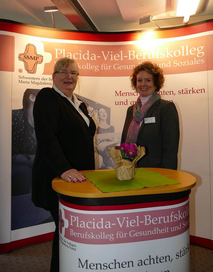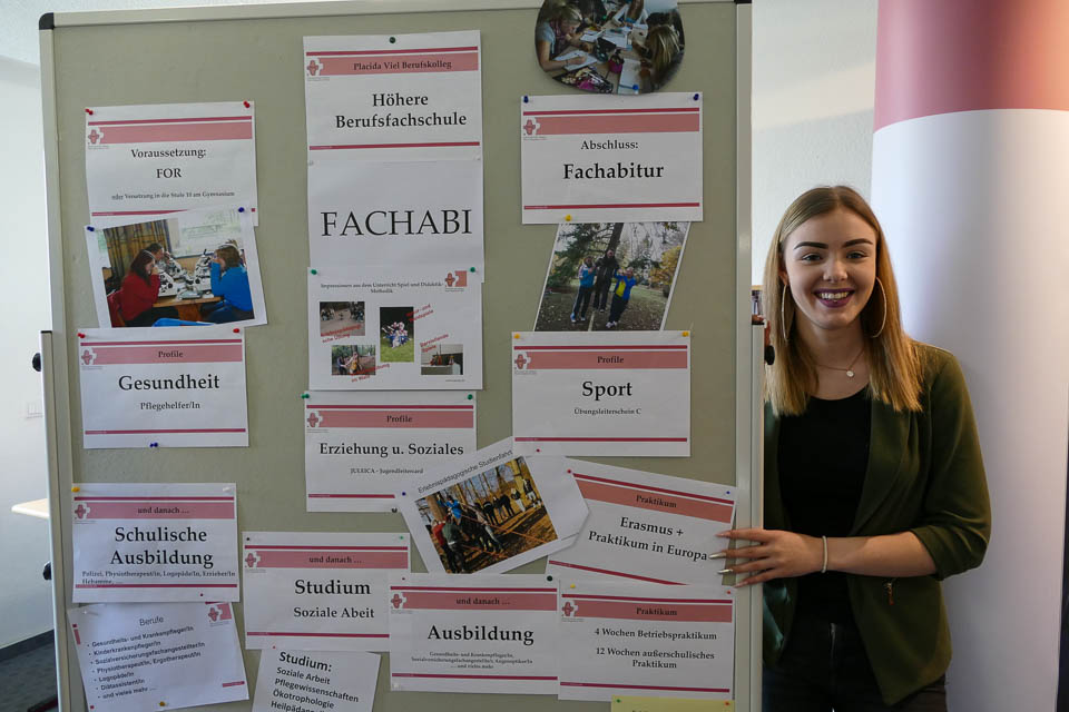 Oder auch Ehemalige, die ihre aktuellen Studien- und Ausbildungsplätze vorstellten. So zum Beispiel die ehemalige Placida-Absolventin Sabrina Urban. Die Abiturientin von 2014 ist nun fertig ausgebildete Polizeikommissarin und beriet die derzeitigen „Placida“-Schüler, ob diese Laufbahn denn auch etwas für sie sei. Dass die coole Polizistin auch mal am „Placida“ die Schulbank drückte, war für viele Schüler äußerst spannend. Stefano Petry, Fachabiturient des Jahres 2016, wiederum ist sogar dem Träger SMMP treu geblieben: Er macht die Ausbildung zum Physiotherapeuten bei der Bildungsakademie für Therapieberufe SMMP JG in Bestwig und informierte nun am „Placida“ über die schulgeldfreien Ausbildung. Und auch die junge Dame hinter dem Infostand der Katholischen Kliniken im Märkischen Kreis war eine Ehemalige: Verena Jordan, die 2016 die Sozialassistenten-Ausbildung beendet hatte und nun die Ausbildung zur Gesundheits- und Krankenpflegerin bei den Katholischen Kliniken im Märkischen Kreis macht. Auch bereits seit zwei Jahren mit dabei: Laura Spiekermann studiert an der Stenden Hogeschool in den Niederlanden. Sie informierte die aktuellen Placida-Schülerinnen und Schüler, wie Studieren ohne Numerus Clausus in Holland funktioniert und welche Chancen dieses eröffnet.