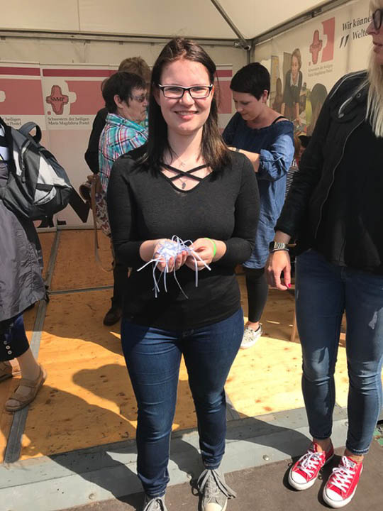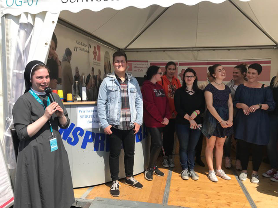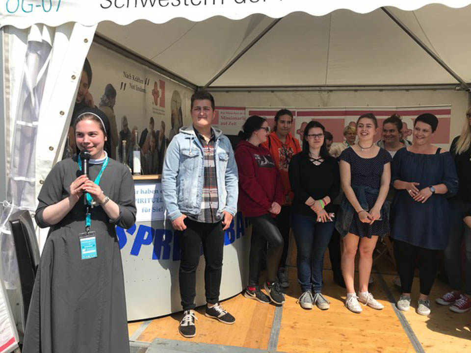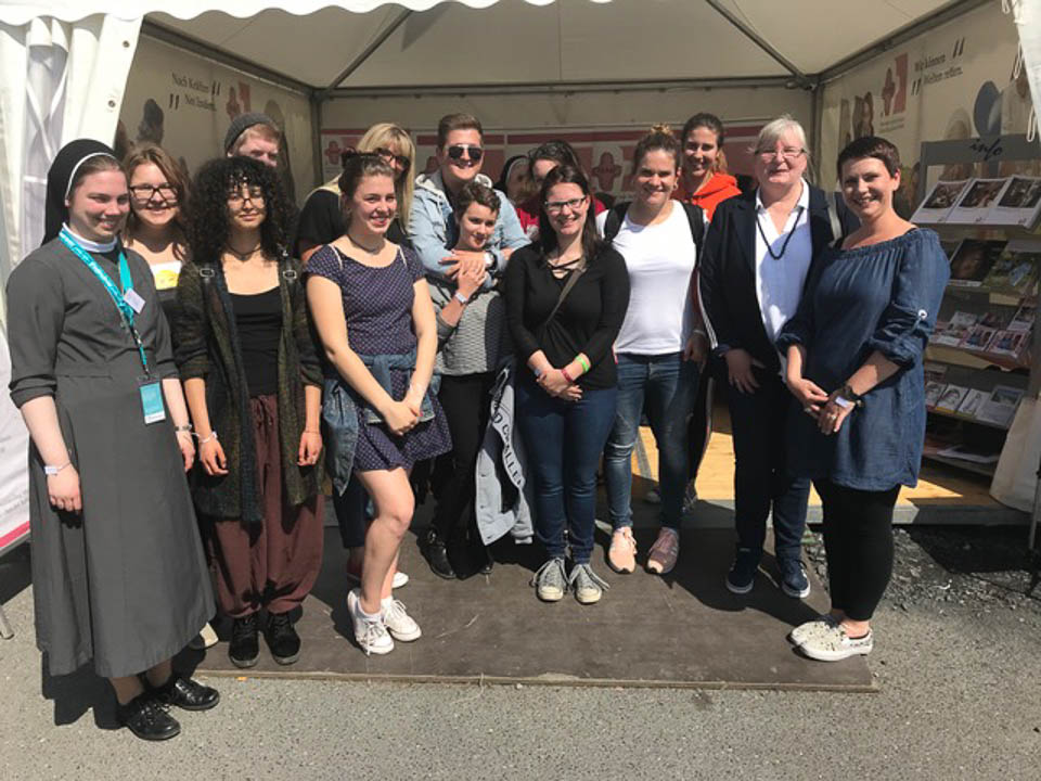 Diese war gemeinsam mit Schulleiterin Gaby Petry, Lehrerin Chantal Köhler (Schulseelsorge), Lehrerin Eva-Maria Reis und acht Schülerinnen und Schülern der Gottesdienst-AG nach Münster gefahren. Dort präsentierten sie ihre Schule am Stand der Ordensgemeinschaft SMMP, dem Schulträger des „Placida“.
