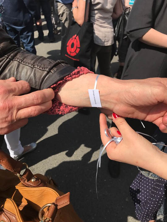 Im Anschluss gingen die Schülerinnen und Schüler durch die Menge und banden den Zuhörern einen Friedensgruß um die Handgelenke, die sie selber zuvor in der Schule gebastelt hatten. „Wir wollen die Leute dadurch segnen mit Frieden, Freude, Gelassenheit und Freiheit“, so Irina Rebbe.
