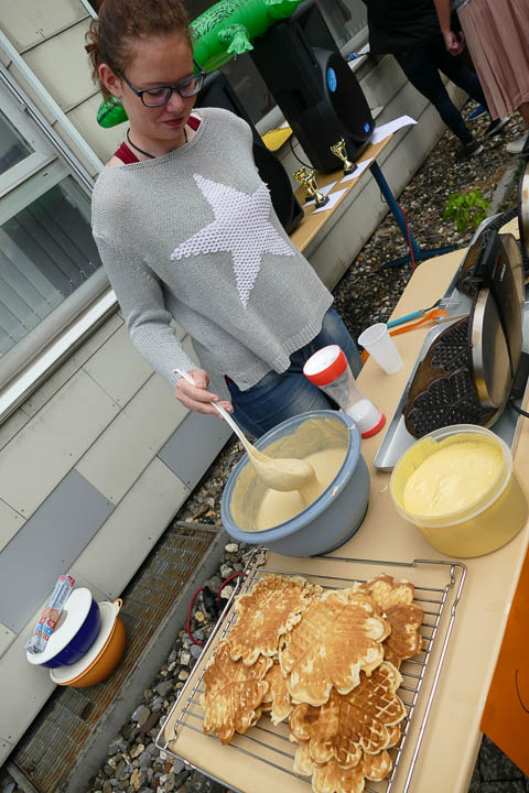 Zwar gab es wie üblich Salate und Würstchen vom Grill sowie alkoholfreie Cocktails, doch der frühen Stunde wurde auch mit frisch gebackenen Waffeln sowie Kuchen Rechnung getragen.