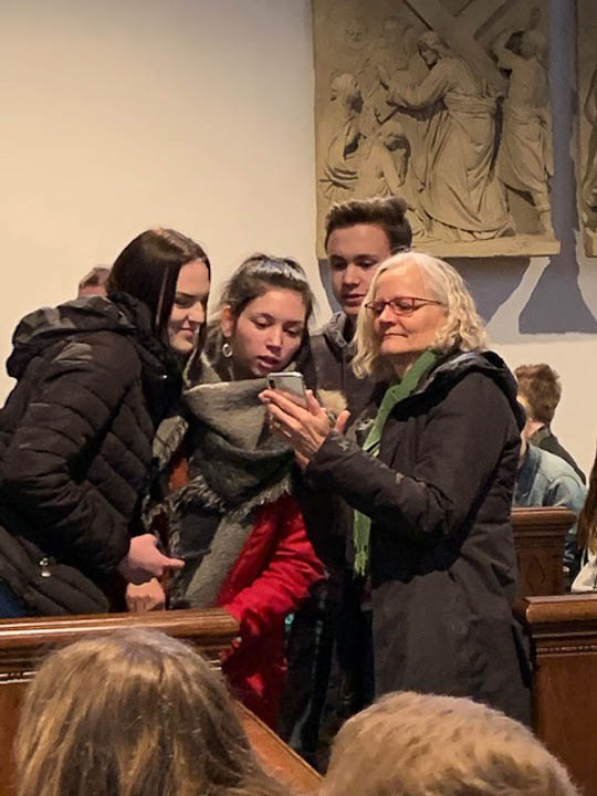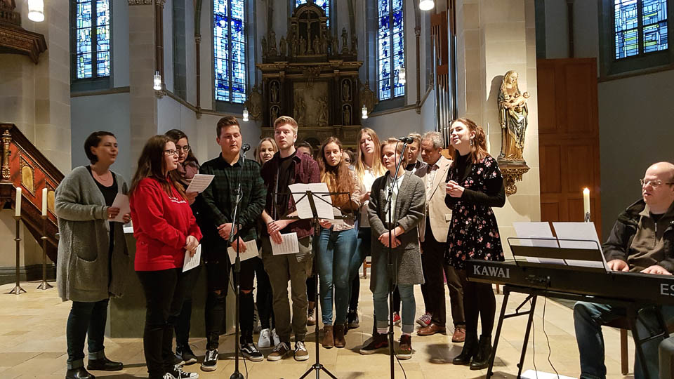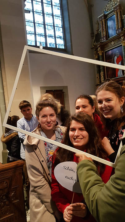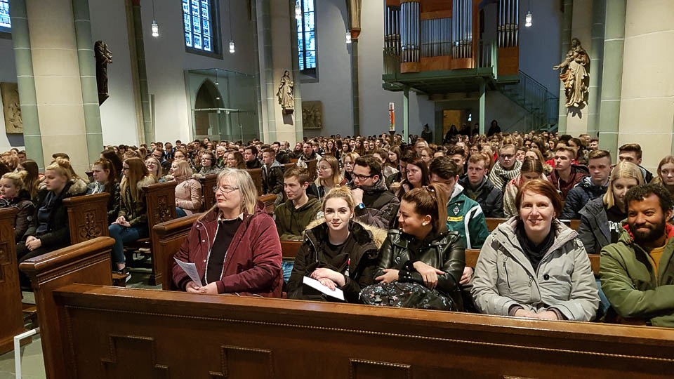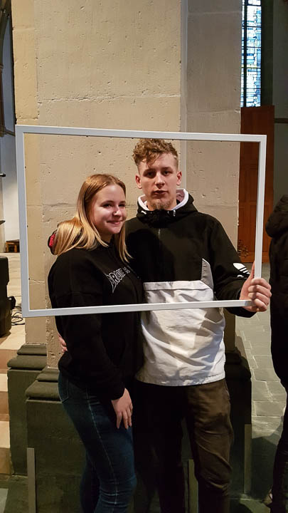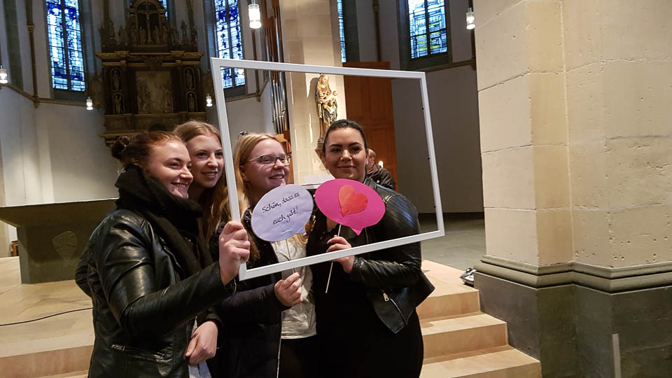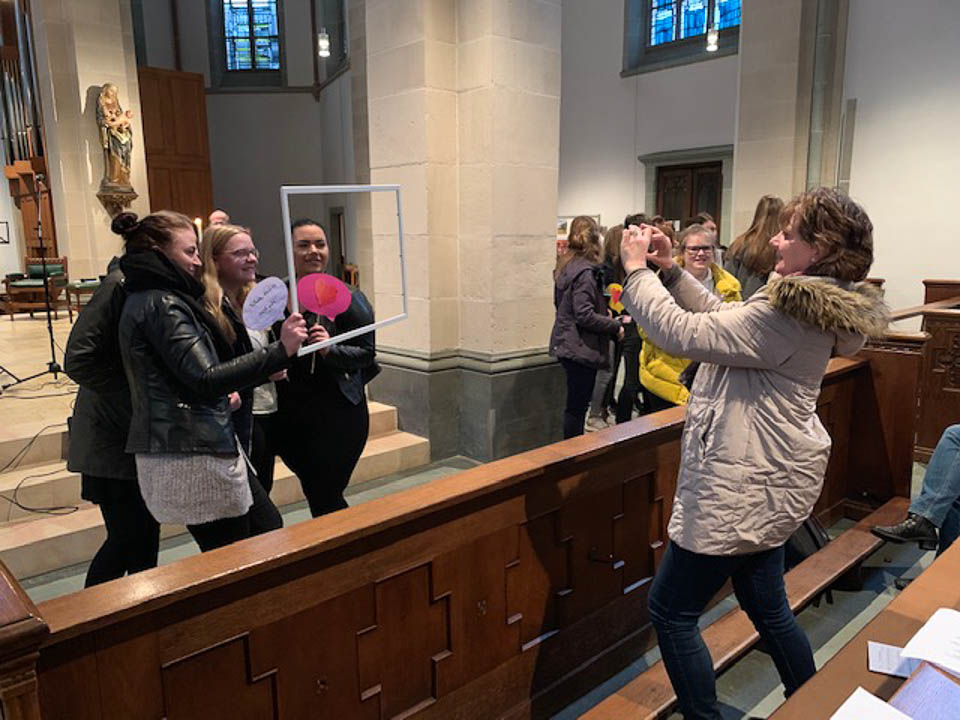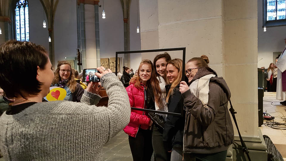 „Es gilt, eine neue Perspektive einzunehmen, mit Gewohnheiten zu brechen“, erklärte Chantal Köhler (Schulseelsorge) bei einem Wortgottesdienst in der St.-Vincenz-Kirche zu Beginn des Projekttages. „Das ,Placida‘ will sich als Gemeinschaft zeigen.“ Pastor Uwe Knäpper vom Pastoralverbund machte dazu einen Vorschlag: sieben Wochen ohne Selfies, „ohne mich selbst in den Mittelpunkt zu stellen“. Dies wurde bei einer Aktion im Gottesdienst gleich praktisch umgesetzt: Schüler und Lehrer konnten sich in Gruppenfotos mit ihren „Lieblingsmenschen“ ablichten lassen.