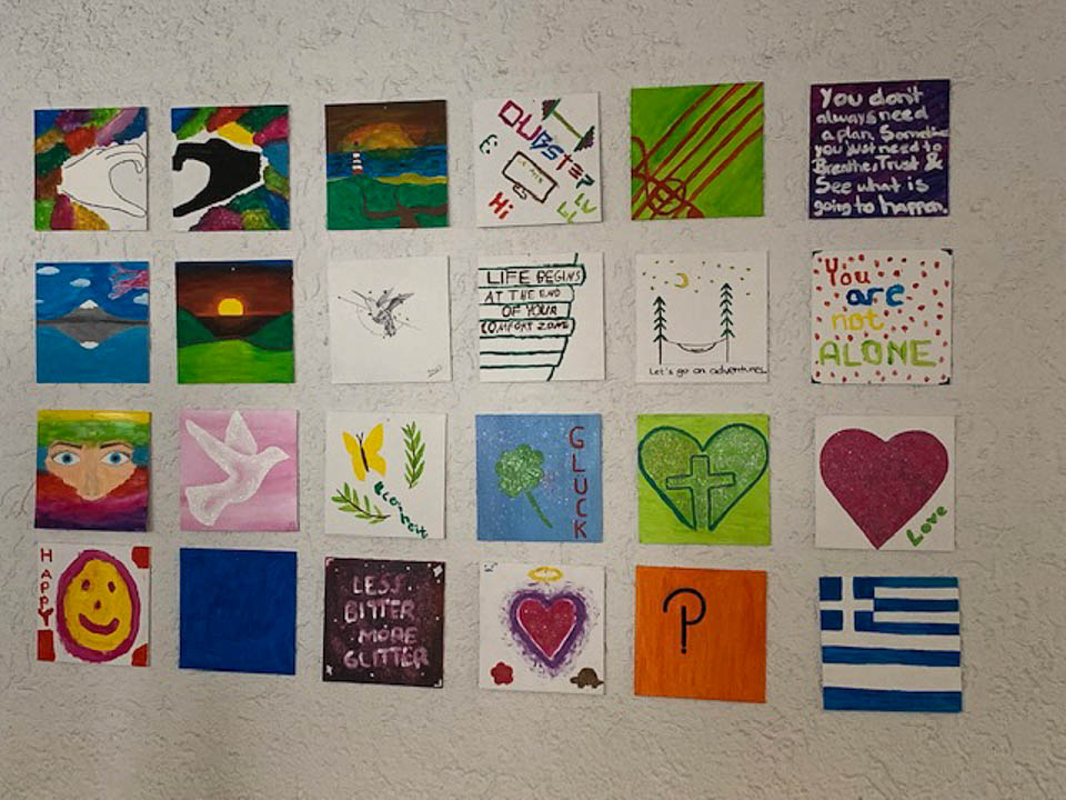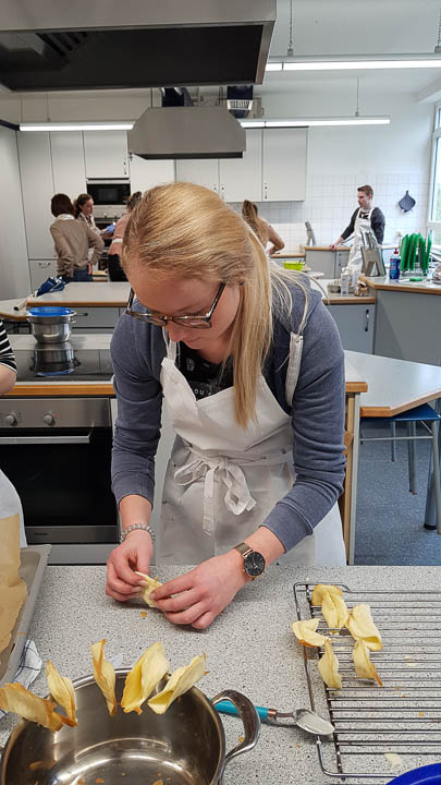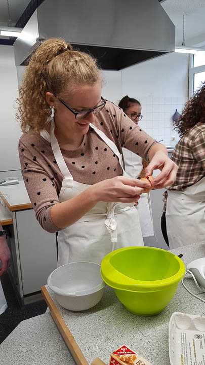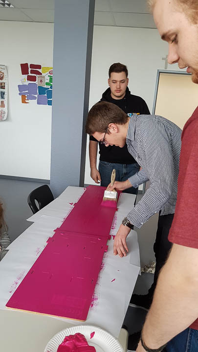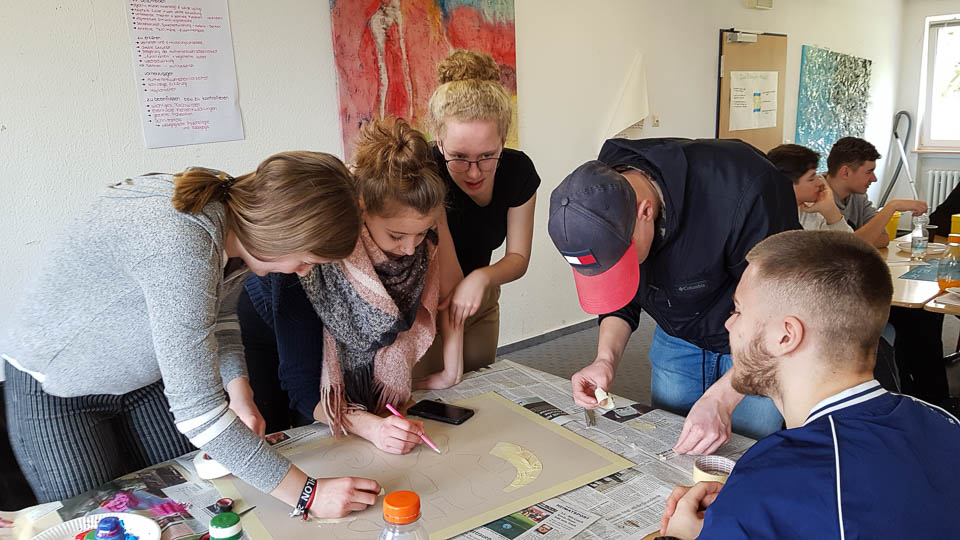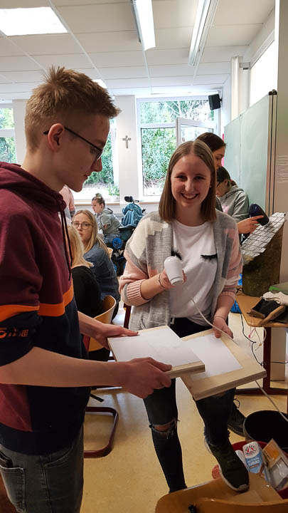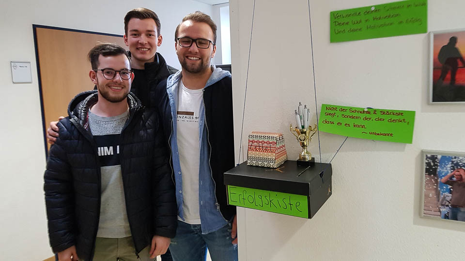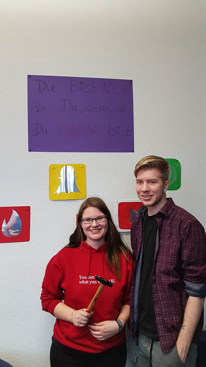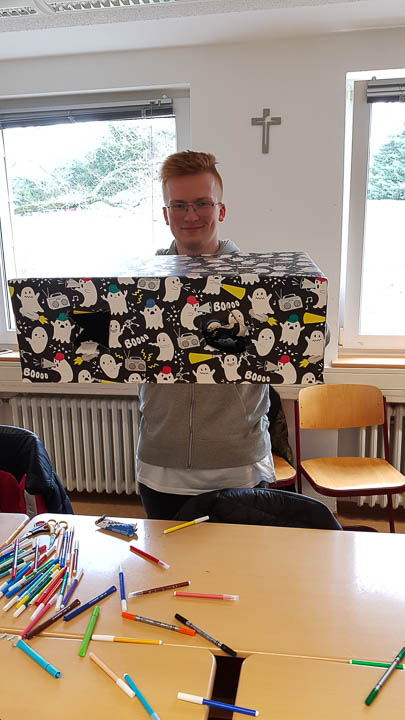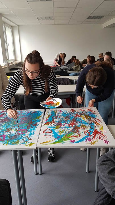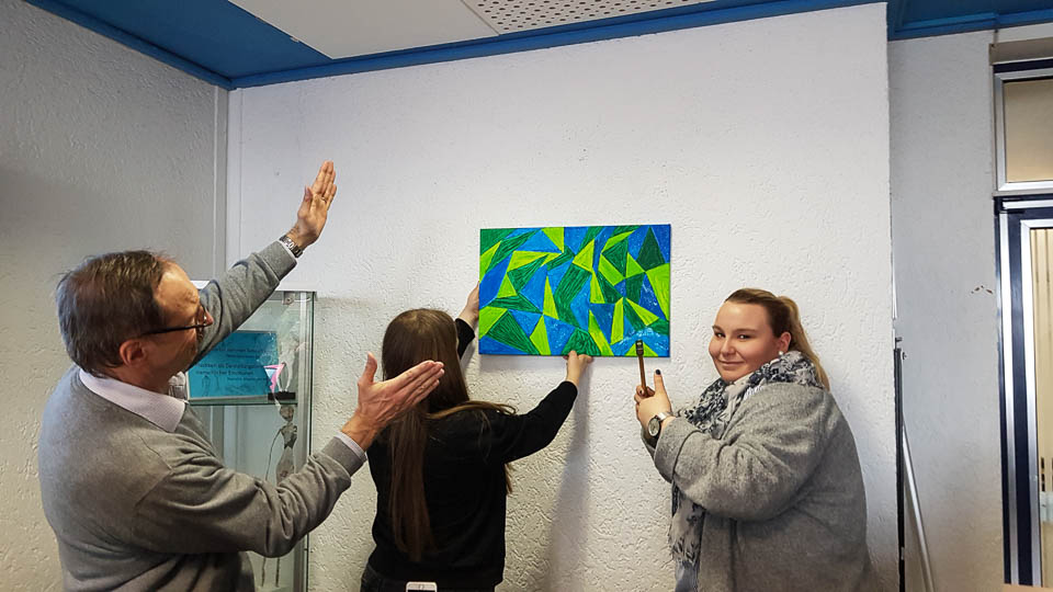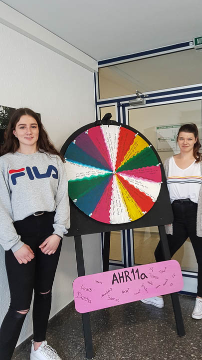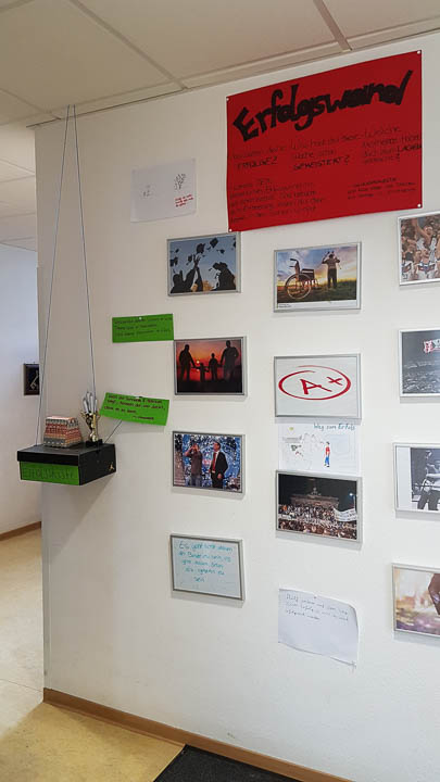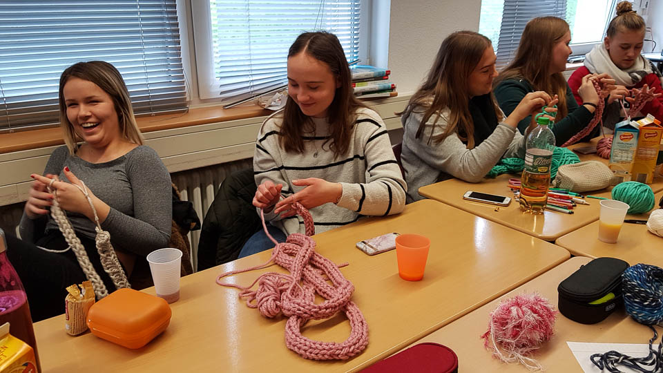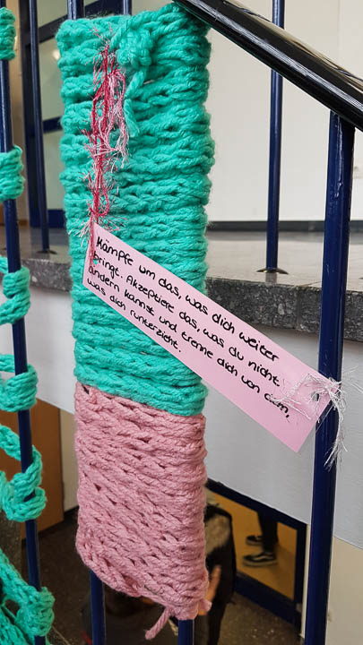 Und so wurde gestrickt, gebacken, gebastelt, gehämmert, gemalt und vieles mehr. Am Ende hatte beispielsweise die Kinderpfleger-Oberstufe ein Spiegel-Mosaik mit Sprüchen gefertigt. Eine Abi-Klasse fertigte ein Glücksrad mit glücklich machenden Lieder-Vorschlägen. Eine andere fertigte eine „Erfolgswand“ mit Fotos von Erfolgserlebnissen. Eine Fachabi-Klasse verschönerte ein Treppengeländer mit „Urban-Knitting“ und liebevollen Sprüchen. Zwei andere Klassen kooperierten und backten jede Menge Glückskekse.