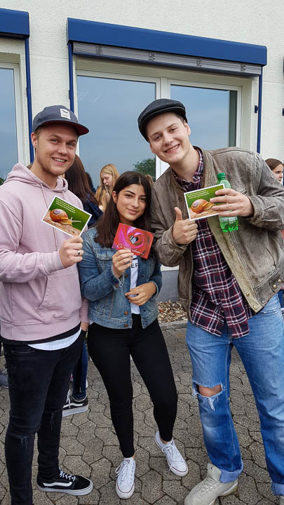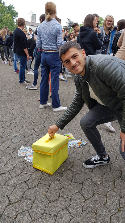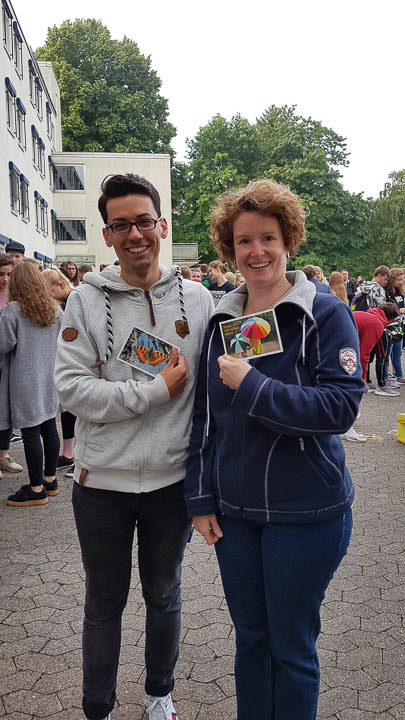 SV-Lehrerin Chantal Köhler und Schulsozialarbeiterin Irina Rebbe luden am letzten Schultag zur üblichen Postkarten-Aktion auf den Schulhof ein. Es gab viele bunte Postkarten, die an sich oder Freunde selbst adressiert werden konnten. Gesammelt wurden sie in einer leuchtend gelb beklebte „Ferienpost-Box“. Die Lehrer verschicken diese dann gegen Ende der Ferien.