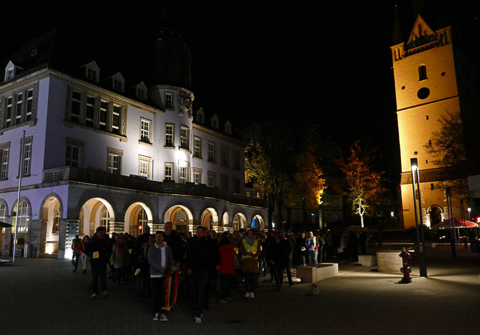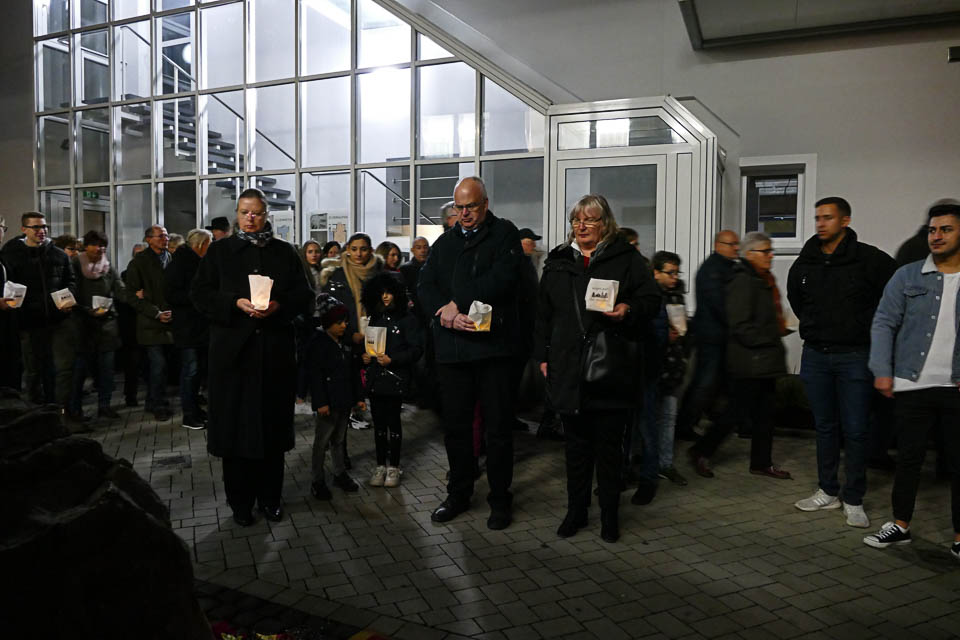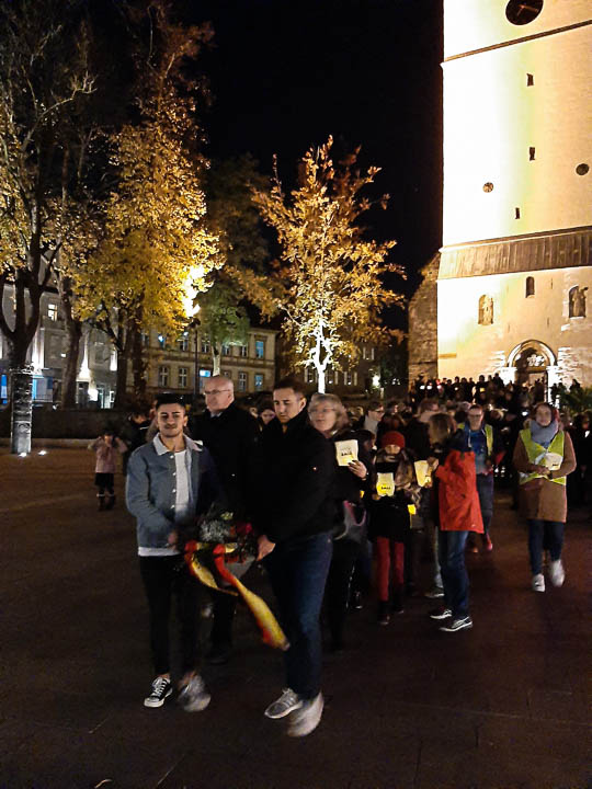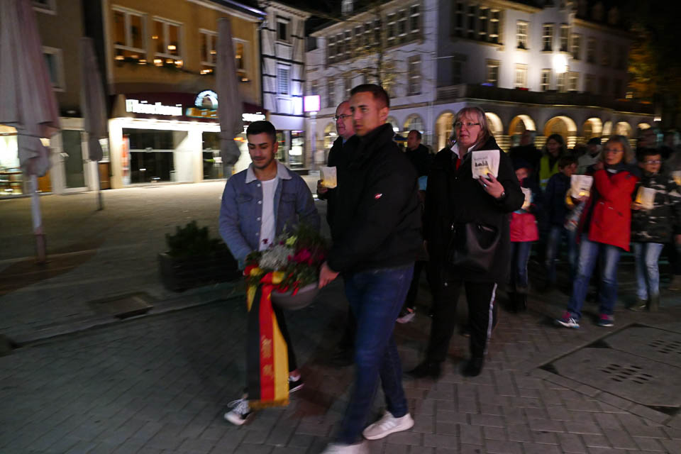 Die „Placida“-Schüler Serhat Sahin und Bjarne Lengelsen trugen dann mit Bürgermeister Martin Wächter einen Gedenkkranz zur Gedenkstätte an der Hochstraße – gefolgt von den Besuchern, die die „Augen auf!“-Lichtertüten trugen. An der Gedenkstätte wurden dann noch die Namen der Ermordeten von Schülern vorgelesen.