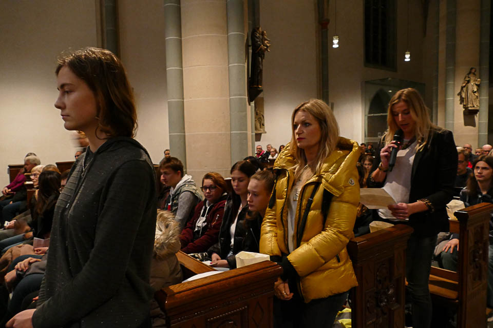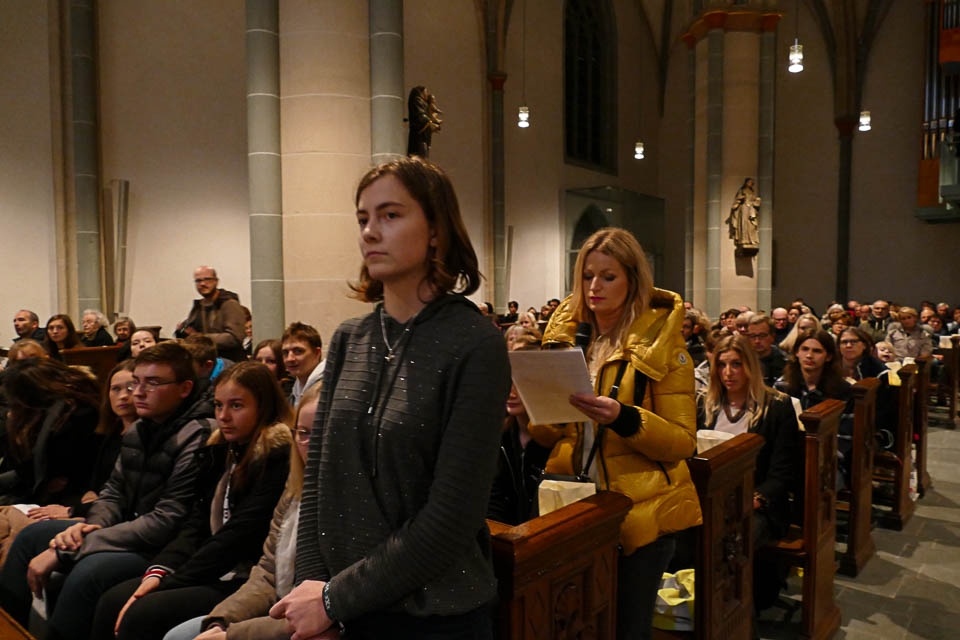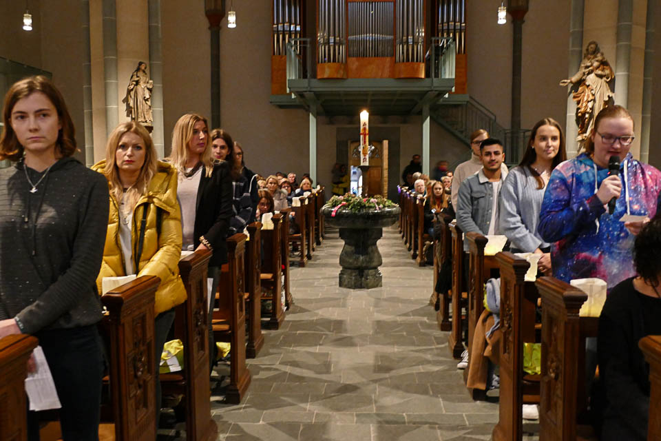 „Placida“-Schulleiterin Gaby Petry nahm die Begrüßung vor, leitete über zu einer Aktion ihrer Schule, bei der Lehrkräfte und Schüler Zitate von Margot Friedländer, einer Holocaust-Überlebenden. Friedländer hatte schon im letzten Jahr eine Grußbotschaft zu der Veranstaltung geschickt und im September eine Schülergruppe nach Berlin eingeladen. Ihre Worte schallten eindrucksvoll durchs Gotteshaus, alle waren tief bewegt: „Ich spreche für alle, die unschuldig ermordet wurden.“